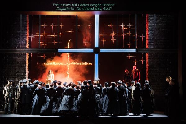 In den überwiegend geometrisch gestalteten, immer wieder neue Räume öffnenden Bühnenbildern ist zu erkennen, dass Walter Schütze zusätzlich zu seinem Studium von Bühnen- und Kostümbild an der Technischen Universität Berlin, u.a. bei Peter Sykora (der das Bühnenbild des legendären „Tunnel-Ring“ von Götz Friedrich an der Deutschen Oper Berlin schuf) Architektur an der Technischen Universität Darmstadt studierte. In dieser Bildästhetik gelang in Cottbus auch ein atemberaubendes Autodafé mit einer von Kreuzen beherrschten Szene sowie einem großen und gar brennenden Kreuz über den im Hintergrund mit viel Bühnennebel angedeuteten Scheiterhaufen für die zuvor über die Bühne getriebenen Ketzer. Vor dem Hintergrund einer allgemein guten und teilweise packenden Personenregie ließ der Regisseur Prinzessin Eboli und Elisabeth von Valois im 3. Bild des 1. Aktes allzu plakativ und lang mit ihren Fächern wedeln, etwas weniger davon wäre hier mehr (gewesen).