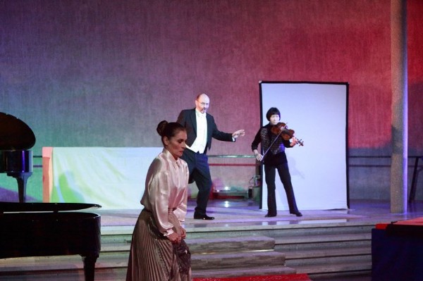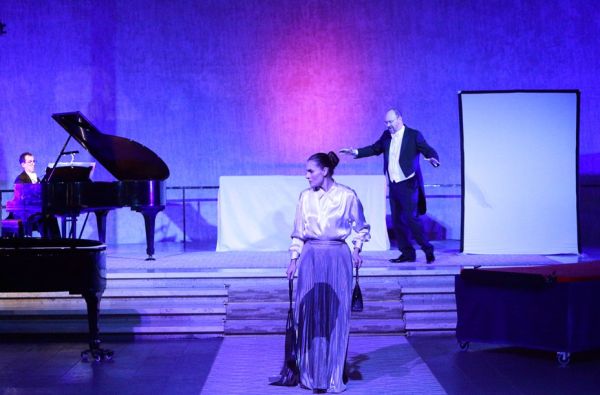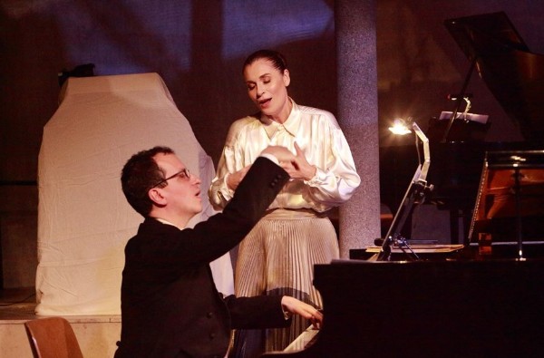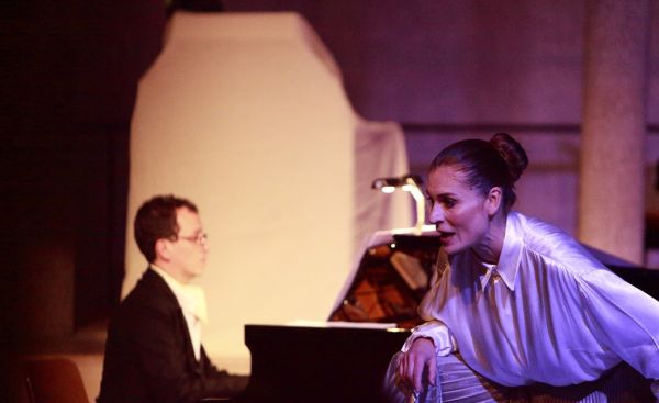 Anna S., gesungen und gespielt von Dzuna Kalnina, empfängt das Publikum in der Weihehalle der Unitarischen Freien Religionsgemeinde spielend am Flügel. Diese Halle wirkt mit ihrem halbrunden um einige Stufen erhöhten Altarraum und den zwei Säulen wie eine Opernbühne, opulent bestückt mit gleich zwei Flügeln, einer davon geöffnet (Bühne und Licht Frank Keller). Für den Musiktheater-Abend wurde Musik von Vincenzo Bellini, Georges Bizet, Wolfgang Amadeus Mozart, Jacques Offenbach, Richard Strauss, Johann Strauß, Giuseppe Verdi, Johann Sebastian Bach und Hugo Wolf ausgewählt. Als Anna S. mit dem Pianisten die Salome einstudieren will weißt er sie, die ja aus der eher leichten Muse kommt, darauf hin, dass es sich um Musik von Richard Strauss und nicht von Johann Strauß handelt. Der Pianist Stanislav Rosenberg, der die musikalische Leitung der Inszenierung innehat, spielt gleichzeitig die Rolle des Aloys Obrist. Während der Proben zur Salome begann wohl das Verhältnis mit Anna S.