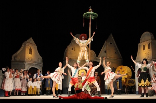 Heute wird die „Nationaloper“ von der tschechischen Oper Prag in Ko-Produktion mit dem Opernhaus F.S. Saldy Liberec aufgeführt. Das Ganze in tschechischer Originalsprache mit deutschen Übertiteln, damit natürlich authentisch. Und dies ist ein (ganz) kleines Manko. Die tschechische Sprache wirkt auf uns sehr hart, sehr trocken, dadurch verliert die herrliche Musik ein ganz kleines bisschen. Das Orchester wird von Frantisek Babický geleitet. Und dies ist schon einer der ersten großen Pluspunkte. Die Musik Smetanas ist flott, leidenschaftlich, das Tempo enorm und hier gehört eine leitende Hand hin, die sowohl kräftig und gewaltig das Orchester erbeben lässt, aber es gleichzeitig dort zurücknimmt, wo den Sängern der Raum eingeräumt werden muss um entsprechend zu brillieren. Und Babický gelingt es gekonnt, die leidenschaftlichen Klänge, alles überwogend und gewaltig daher donnernd zu bändigen und gleichzeitig dieses fulminante Orchester zurückzunehmen und entsprechend sängerfreundlich agieren zu lassen. Die leidenschaftliche Musik Smetanas holt immer dann ein bisschen Luft, wenn es die Sänger mit ihren Arien und Duetten umschmeichelt. Die Inszenierung von Vaclav Veznik ist zurückhaltend, der damaligen Zeit entsprechend, unauffällig aber gleichzeitig beeindruckend. Farbenfroh und bunt, einfach und dennoch einfach gefällig das Bühnenbild von Jan Vancura, welches von den farbenprächtigen Kostümen von Lidmila Svarcova eindrucksvoll unterstrichen wird. Einen großen Einfluss auf das Gelingen dieser Oper haben auch der Chor und die Tanzdarbietungen, die einen großen Teil der Oper einnehmen, in kaum einer anderen Oper hat man es mit mehr Tänzen zu tun wie hier. Und hier kann man Rudolf Karhanek als Choreographen und Martin Veselý als Chorleiter nur eine ausgezeichnete Arbeit attestieren. Ein buntes farbenprächtiges Bild läuft in den 2 ½ Stunden, die viel zu rasch vergehen, vor dem begeisterten Publikum ab, und dies nicht nur in den Zirkusszenen, welches nicht mit Szenenapplaus aber vor allem nicht mit einem großen langanhaltenden Schlussapplaus zeigt, wie sehr ihr diese Aufführung gefallen hat. Die ganze Aufführung ist leicht und locker dargeboten und macht deshalb besonders Spaß.