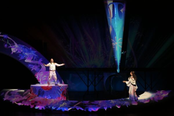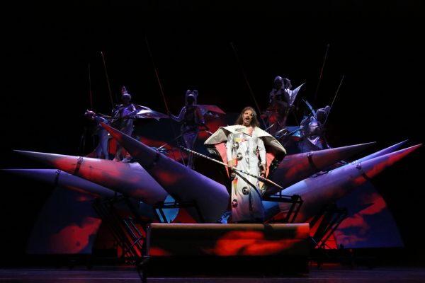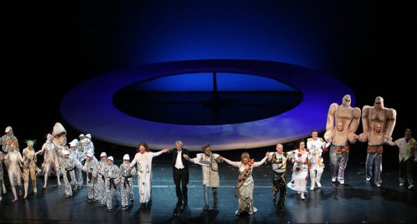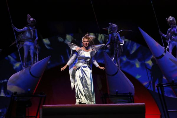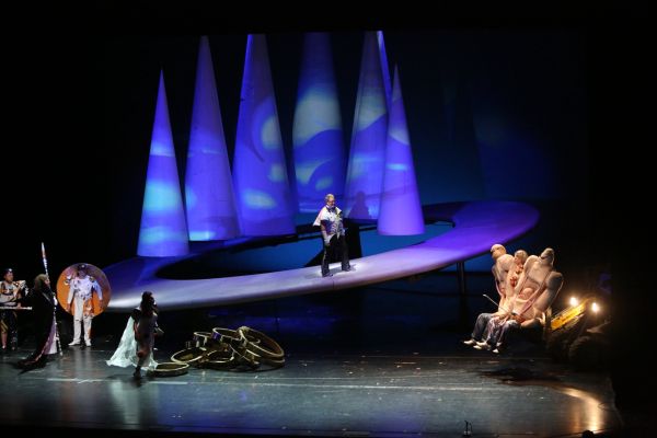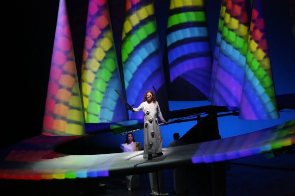 So ist es ein kleines Wunder, vielleicht auch ein großes, dass dieser Sofioter „Ring“ pünktlich und mit beeindruckenden Leistungen am Forggensee beginnen konnte, Gott sei dank bei „Kaiserwetter“. Die Spannung war natürlich groß. Alle Wagnerverbände waren angeschrieben worden, und eine Reihe von Delegationen fand sich zum „Ring“ ein, auch aus Übersee. Zur Premiere des „Rheingold“ erschien auch einige Politpominenz aus Bulgarien und Bayern. Wieder können der große und im wesentlichen aus zwei bühnenbreiten Hälften bestehende und damit beliebig variationsfähige und begehbare Ring, sieben kegelförmige Konusse in verschiedenen Größen, und eine Art Mandorla bei der Dramaturgie Kartaloffs überzeugen. Es sind minimalistische Elemente, geschaffen vom Bühnenbildner Nikolay Payanotov, der auch für die Kostüme verantwortlich zeichnet, reduziert auf wesentliche symbolische Bedeutungen, die aber eine Vielzahl von Inhalten, Visionen und Assoziationen ermöglichen. Kartaloff setzt sie in ständiger Variation dramaturgisch ein, wobei das Multimedia Design von Vera Petrova und Georgi Hristov sowie die exzellente Lichtregie von Andrej Hajdinjak und Emil Dinkov eine ganz entscheidende Rolle spielen.