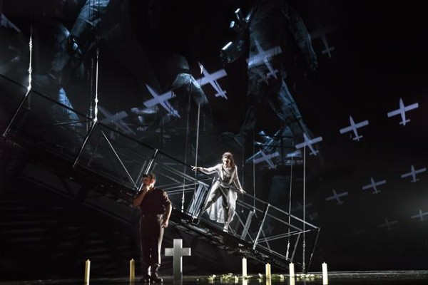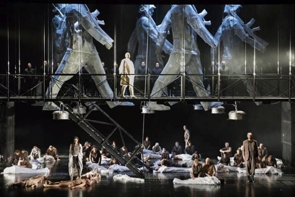 Mit der Regiearbeit der französischsprachigen Uraufführung war 2012 Carlos Wagner betraut worden, der nicht der Versuchung unterliegt, das Werk allzu sehr zu politisieren. Nach Freiheit und Unabhängigkeit strebende Flamen sind uns auch heutzutage nicht ganz fremd, doch der aus Venezuela stammende Regisseur belässt es bei einem eher indifferenten Verlegen der Handlung ins 20. oder 21. Jahrhundert. Die Kreationen des belgischen Modelabels A.F. Vandevorst, in die man die Protagonisten gesteckt hat, sind von schlichter Tristesse beim Volk, beim Herzog von einer Art extravagantem Understatement. Überdimensionale Soldatenfiguren, die dem Land Brobdingnag aus Gullivers Reisen entstammen könnten, sind so allgegenwärtig wie Leid und Tod, scheinen übermächtig und die Revoltierenden unter ihren Stiefeln zu zerdrücken. Auf der bis auf wenige Requisiten leeren Bühne von Alfons Flores, die deutlich durch ein Stahlgerüst in ein „Oben“ und ein „Unten“ geteilt ist, ist eigentlich das durchdachte und fein austarierte Licht von Fabrice Kebour der Inszenator, das die ausgefeilte Personenregie von Carlos Wagner noch verstärkt. Wagner findet starke Bilder, zeichnet den Herzog als machthungrigen Despoten, ganzkörpertätowiert und brutal – und doch um die Liebe seines wiedergefundenen Sohnes buhlend. Dass sich der nicht ganz freiwillig vor seinen Vater wirft, um ihm das Leben zu retten, ist da nur konsequent.