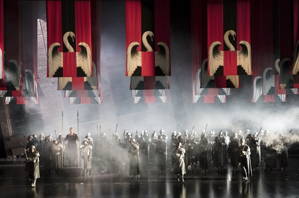Alden sieht in seiner schlüssigen und lebendigen Inszenierung im Titelhelden mehr als eine Lichtgestalt für Elsa, er wird bei ihm zum Hoffnungsträger für ein ganzes Volk, das in einer Atmosphäre der Unterdrückung sein Dasein fristen muss. Die Farbgebung von Uniformen und Flaggen sowie das stetig wiederholte Hochreißen des rechten Armes machen überdeutlich, zu welcher Epoche der Geschichte der Engländer hier die Parallelen zieht. Auf der gelungenen Bühnen von Paul Steinberg wird mittels des ausgetüftelten Lichtes von Adam Silverman von Anfang an Unbehagen erzeugt, auch Elsa ist von Beginn an Opfer und selbst König Heinrich scheint stellenweise zur Marionette des eigenen Regimes verkommen. Von glanzvoller Macht ist hier, wo selbst die Gebäude in Schieflage geraten sind, nichts übrig, die Treue der Gefolgsmänner ist von der Terrorherrschaft erzwungen, die aus überdimensionalen Lautsprechern schallt. In dieser düsteren Welt erscheint Lohengrin unwillkürlich als Heilsbringer, ganz in Weiß gewandet (Kostüme: Gideon Davey), und bleibt doch weniger verklärtes Ideal als echter Mensch, der Gewalt verabscheut und Liebe und Vertrauen sucht. Telramund und Ortrud sind in ihrer Gier nach Macht und nacheinander vereint, auch wenn Ortrud gleich der Lady Macbeth das Feuer in ihrem Mann immer wieder aufs Neue entfacht, sobald der Schwäche zeigt und so sind beide trefflich als Gegenpart zu Lohengrin und Elsa gezeichnet. Die bleibt am Ende in Trostlosigkeit, nicht einmal der wiedergefundene Bruder kann ihr Hoffnung geben.