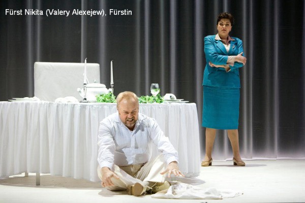 Tatjana Gürbaca hat sich von Klaus Grünberg für das erste Bild in der Herberge, in der die größte Personenzahl auftritt, einen Guckkasten bauen lassen, der die ohnehin schon ziemlich kleine Bühne des Genter Theaters noch einmal um ein Drittel verkleinert. Das ist praktisch gedacht, denn dadurch braucht sie sich bei dieser Chorszene um Bewegungsregie keine Gedanken zu machen: alle, ein Autonomer, ein Maler, ein Nackter, auch ein weißer Bär, hopsen dicht an dicht in diesem Raum auf und nieder oder stehen hinten auf einer tribünenartigen Aufschichtung von umgedrehten Getränkekästen. Der Raum ist mit Graffitis besprüht; sollen ein Malertisch und eine schon neu gestrichene Eingangstür verdeutlichen, dass sich diese Chaoten-Gesellschaft einen renovierten Raum schaffen will. Wer hat ihn denn dann besprüht? Nachdem Natascha den Fürsten eingewickelt hat, endet der erste Aufzug in einem Tanz, bei dem Mamirov die Hosen herunter gezogen werden. Der zweite Akt spielt im Palast des Fürsten. Zuerst tritt seine Frau im kühlen Kostüm einer Quotenvorstandsfrau auf und erteilt ihren Mitarbeiterinnen Anweisungen. Mamirov kommt herbei und verpetzt den Fürsten. Dann wird der Tisch gedeckt: drei Gedecke und ein Stuhl sind vorhanden. Die Atmosphäre ist relativ kühl, zum Essen hat keiner Lust. Die Fürstin macht ihrem Mann eine heftige Szene, wobei sie das Oberteil ihres Kostüms ablegt. Nun geht plötzlich die Hinterwand des Esszimmers zu Bruch und die Getränkekastentribünen mit der Spaßgesellschaft von vorhin werden herein gefahren. Die machen aber gar keinen Spaß, werden aber, obwohl sie ganz schön viele sind, von Mamirov und zwei Hausdienern leicht in Schach gehalten. Die Revoluzzer ihrerseits rufen nun um Hilfe, der böse Mamirov erschießt auch gleich noch einen oder zwei von ihnen, ehe Juri kommt und die Menge beruhigt. Die Fürstin drängt darauf, die „Schlange“ zu eliminieren, die vermeintlich ihre Ehe zerstört hat.