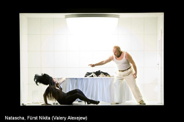 Das soll im dritten Akt passieren, für den auf halber Bühnenhöhe ein kleiner weißer Kasten mit Tisch aufgebaut ist, zu dem man über eine Leiter gelangt. Drinnen ist Natascha; als erster kommt der Fürst, der sie sich nacheinander mit Werben, Geld und Gewalt gefügig machen will, vergeblich. Später kommt der Prinz Juri. Er verfällt der Frau. Das ist die einzige Szene der Oper, die ein wenig Seele vermittelt. Im Übergang zum vierten Aufzug wird pantomimisch eine Zirkusparodie aufgeführt. Nun bekommt auch der Bär aus dem ersten Akt eine Bedeutung. An finsterem Ort haben sich Natascha und Juri zur Flucht verabredet. Leider kommt auch die verkleidete Fürstin an den finsteren Ort, um sich dort von einem Zauberer einen Gifttrunk bereiten zu lassen, mit welchem sie Natascha beseitigt, die dann in einem Kasten noch die zersägte Frau spielt. Mit der gleichen scharfen Waffe ermordet der Fürst, der auch seinen Weg an diesen Ort gefunden hat, seinen Sohn, ehe er in großes Jammern ausbricht, weil er sein Leben verpfuscht hat. (Gewaltige Orchesterschläge!) Dieser letzte Akt besteht nur noch aus Zirkusklamauk, womit die Regie wohl nach einigen ordentlichen Ansätzen in den beiden Mittelakten zu verstehen gibt: die Tiefe dieses Stücks ist die einer Zirkusnummer. Oder sollte es ein Mysterienspiel sein? Die Regisseurin tat mit etlichen Platituden und inkonsistenten „Einfällen“ dem ohnehin schwachen Werk keinen Gefallen; die Charaktere bleiben unverfeinert; es gibt keinen Sympathieträger in der Oper. Dazu wird häufig gegen den Text inszeniert. Was seitens der Dramaturgie schwer verständlich bleibt: es sund acht unerhebliche Nebenrollen besetzt, dafür werden zwei wesentliche Rollen, die miteinander gar nichts zu tun haben und vom Komponisten mit unterschiedlichen Stimmlagen gekennzeichnet sind, in eine zusammen- gefasst: die des käuflichen falschen Mönchs Paisi, der als Hinterträger gebraucht wird, und die des Giftmischers Kudma. Frau Gürbaca, in den Presseunterlagen der Vlaamse Opera schon als Intendantin des Staats-theaters Mainz bezeichnet, bleibt eine schlüssig gezeichnete am Werk orientierte Inszenierung wieder einmal schuldig.