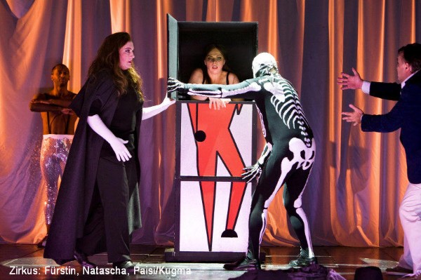 Für einen Lichtblick hingegen sorgte das von der Vlaamse Opera verpflich- tete hochkarätige internationale Sängerensemble für die Hauptrollen, überwiegend Muttersprachler. Die litauische Sopranistin Ausrine Stundyte sang an diesem Abend die Natascha. Als Wirtin beherrschte sie ihre Gesellschaft in schwarzem Kostüm mit großem Federhut; ihre warme dunkel timbrierte Stimme neigte zu Beginn noch etwas zum Flackern; im lyrischen Gesang kam sie sehr gut rüber. Olga Savova konnte in der Rolle der Fürstin als idealtypisch gelten. Die Nuancen ihres klangschönen Mezzo konnte sie kaum zur Geltung bringen, weil sie das Orchester ankämpfen musste. Das galt vor allem für das große Duett mit dem Fürsten im zweiten Akt, als diese sensible Stelle nur eindimensional im Fortissimo musiziert wurde. Valery Alexejew war hier ebenso betroffen; er hatte aber schon vorher mit seinem runden, eleganten und voluminösen Bariton gefallen. Prinz Juri wurde von Viktor Lutsiuk gegeben, dessen Höhen häufig verzerrt klangen. Taras Shtonda, stimmgewaltig mit kernigem Bass, gab den Mamirov. Nikolai Gassiev musste die Tenorrolle des Paisi und die Baritonpartie des Kudma übernehmen, wobei er – vielleicht situativ bedingt? – als Zauberer in rotem Teufelskostüm viel besser wirkte.