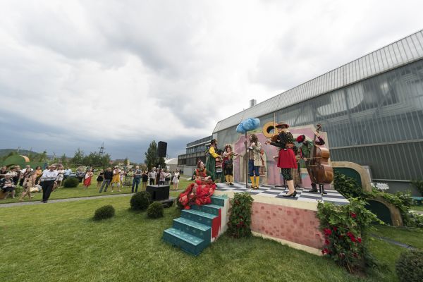 Und so wird das Publikum vor Beginn der Opernaufführung zunächst zu einem Aperitif in den neben der Listhalle neu errichteten Glücksgarten geleitet und dort von Johann Joseph Fux persönlich ( einprägsam gespielt von Christoph Steiner) und einem Spezialensemble für historische Volksmusik launig begrüßt.