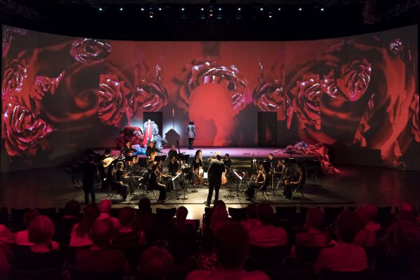 Nach diesem Prolog im Freien nimmt das Publikum im Saal Platz und das Ensemble Zefiro unter seinem Leiter Alfredo Bernardini tritt auf – hinter dem Orchester ein karges Podium mit der in der List-Halle (nicht zuletzt aus akustischen Gründen) bewährten gekrümmten Rückwand, auf die die üppigen, sich stets wandelnden und meist floralen Bilder projiziert werden, die die Medienproduktionsfirma OchoReSotto geschaffen hat. Mir hat sich nicht erschlossen, was diese Projektionen mit dem Stück zu tun haben und inwiefern sie eine „barocke Zauberbühne“ suggerieren sollten – das in der Programmankündigung heraufbeschworene „visuelle Erlebnis“ war es zumindest für mich nicht.