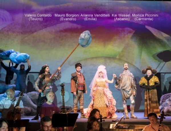 Ihr Bruder und Gegenspieler Ascanios ist der Barockspezialist Mauro Borgioni , der mit plastischer Rezitativartikulation, szenischer Präsenz und Koloraturengewandtheit auffällt. Den Ascanio-Vertrauten Teucro gibt Valerio Contaldo mit sicherem und robustem Tenor. Die in der internationalen Barockszene arrivierte Sopranistin Monica Piccinini gestaltet mit klarer Stimme die Mutterfigur, die für das Happy-End sorgt und die am Ende die – von den Holzbläsern wunderschön begleitete – Licenza auf den Habsburger-Kaiser anstimmt. Im Schlussstück vereinen sich dann alle fünf Solostimmen zum Chor und alles endet im Tanzrhythmus, den der Choreograph des Abends Jörg Weinöhl in heitere Ausgelassenheit umsetzt. Man ist im letzten Viertel des etwa 1 ½ Stunden dauernden Stückes geradezu dankbar, dass (endlich!) durch die Choreographie etwas Leben in die statische Abfolge von Rezitativ – Arie (und das 14 Mal!) kam. Und so gab es ein versöhnlich-heiteres Ende mit großem Beifall des Publikums.