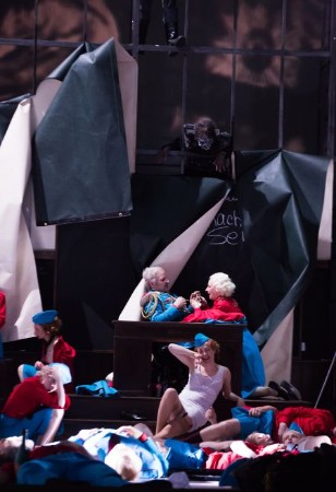 Auch Eric ist ein eher kriegsmüder Außenseiter und wird von den Mädchen verspottet. Der Holländer wird als alter Kapitän mit braunem pelzbesetztem Seemannsmantel eingeführt, er wird ihm aber von den Kadetten zugunsten einer ihrer blaurot-weißen Uniformen ausgezogen. Er stellt letztlich mit seinen kaum sichtbaren Kumpanen eine verlotterte ‚vorkriegshafte‘ Bewegung dar, die aber am Ende des lustig inszenierten Steuermannschor doch Angst einzuflößen vermag, indem dann auch das Ambiente in sich einstürzt, und dahinter eine dunkle wellenreiche Meeresprojektion sichtbar wird. Mit diesem einbrechenden Chaos, wo in einer Orgie mit den Wellen letzte Hüllen fallen, gibt sich Senta final eine Kugel. Insofern ist Steier, was die Beziehreung zum Holländer betrifft, wieder ganz nah an der Wagner’schen Sichtweise.
