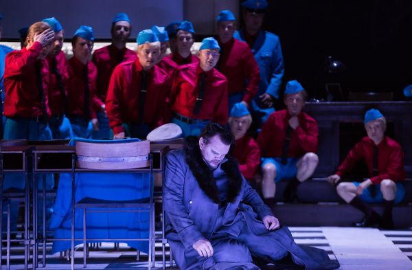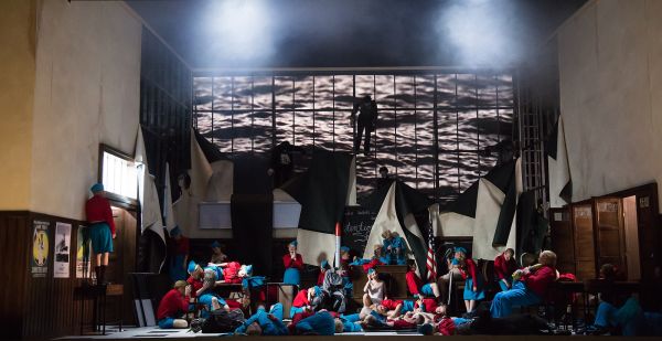 In der Holländer-Neuinszenierung kommt es der Regisseuse Lydia Steier in erster Linie darauf an, eine Gesellschaft mit großer Lust auf Militarisierung zu zeigen. Vielleicht als gebürtige US-Amerikanerin fällt dabei ihre Wahl auf eine ameikanische Elite-Kadettenschule, in der die Kadetten auch gleich in den Uniformen der Landesfarben und bevorzugt kurzen Hosen gekleidet sind (Kost.: Gianluca Falaschi). In der Eingangsszene werden sich s.w.-Filme vom D-Day im 2.Weltkrieg mit den Siegen der Amerikaner angesehen, vom immer wieder aufbrausenden Applaus der Kadetten begleitet. Gleichzeitig vermittelt dieses Gebaren Leichtigkeit und Witzigkeit unter dem Onkel-haften Stabsadmiral Daland, der Krieg wird eher als Spiel denn als Ernst wahrgenonmmen.