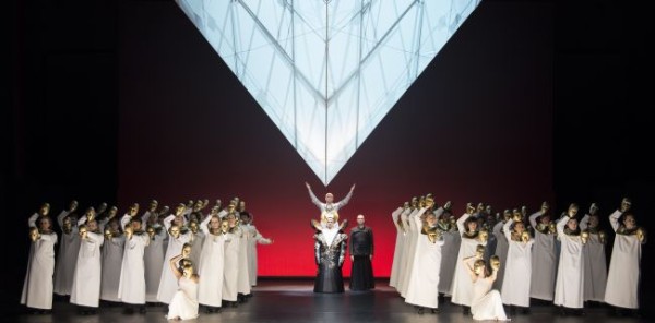 Darüberhinaus arbeitet die Regie mit Kontrasten. Kommt der Chor in Weiß, dann ist das Corps de Ballet in Schwarz und umgekehrt. Wenn die Dance Company die Szene in Bewegung aufmischt, dann bleibt der Chor statisch. Und sicher war es eine große Herausforderung, welche die Regie meisterte: das Mit- und Gegeneinander von Chor und Ballett, zwischen denen immer ein gewisses Spannungsfeld aufgebaut werden konnte. Bühnenästhetisch war das sehr gelungen. Statisch und distant blieb die Führung der Protagonisten; sie blieben durchweg figureheads ohne Blut und Wärme. Viel hatte die Aufführung von einem Mysterienspiel, in welchem Gestik und Handbewegungen an Inszenierungen von Robert Wilson gemahnten, mit dem Glass in früheren Opern zusammengearbeitet hatte.