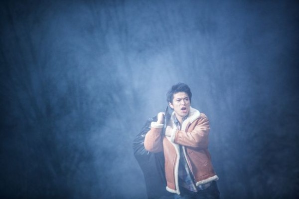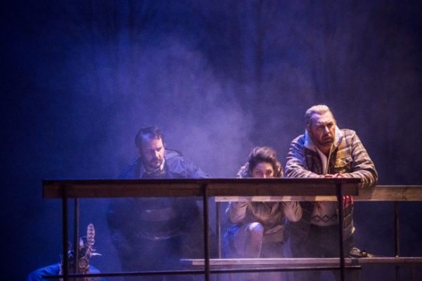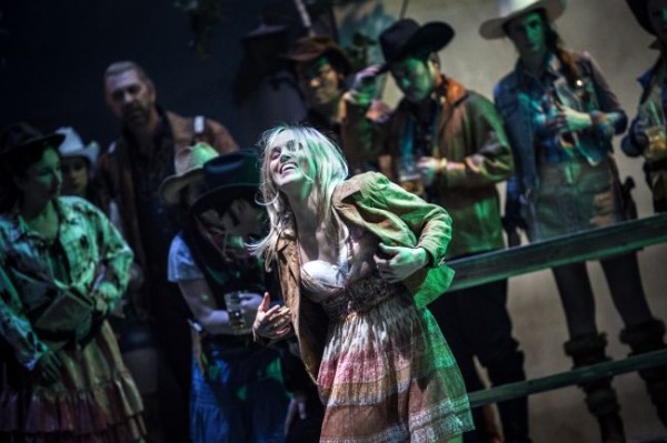 Das Libretto enthält keine szenischen Anweisungen. Vielleicht weil der Komponist die nicht für notwendig hält, da er sehr Konkretes gar nicht anstrebt – oder weil er weiß, dass sich die Regisseure heute daran sowieso nicht halten. Cum grano salis gelingt es dem Regisseur Lorenzo Fioroni, das Geschehen verständlich auf die Bühne zu bringen – aber auch nicht ohne ein paar seiner üblichen „Fioronis“, die komplizierend und wenig erhellend sind. Von Ralf Käselau lässt er sich ein sehr detailfreudiges Bühnenbild bauen. Es ist ein grob zusammengezimmerter Tanzboden mit Schanktisch zwischen Dorf und Wald vor mitteleuropäischer Mittelgebirgskulisse; alles heftig vermüllt wie nach einer Dorffeier (und vielen Operninszenierungen) üblich. Daneben steht die Datsche der „Geliebten“, in der sie den „Fremden“ empfängt. Durch Drehen der Elemente können in schneller Folge die einzelnen Szenenbilder entstehen. Dazu gibt es seitlich noch einen Hochstand, der mal dem Auftreten von „Jäger“, „Schlachter“ und „Gefährtin“ dient; ein andermal als Kapelle mit lauter Votivbildern behängt der „Geliebten“ einen Rückzugsort für Betrachtung und Reue gewährt. Sabine Blickenstorfer hat das Volk und die Akteure in ein buntes Gemisch von zeitgenössischer Bekleidung gesteckt. Dass die teilweise wattierte Wetterkleidung tragen, während mehr als einmal im Text von großer Hitze und ausbleibendem Regen die Rede ist, ist so ein „Fioroni“ – ebenso die Tatsache, dass sich in einer Szene alle mit entsprechenden Kopfbedeckungen als amerikanische Westler verkleiden und dass über der ganzen Szenierie (cvon hinten zu lesen) in Großbuchstaben TWISTER steht. Aber es gelingt Fioroni gut, das unterschwellige Unwohlsein zu zeigen, welches das soziale Ambiente der Dorfgemeinschaft und ihrer Exponenten erzeugt; dazu hätte es nicht der anonymisierenden Papiertüten bedurft, die man sich gelegentlich über den Kopf zieht.