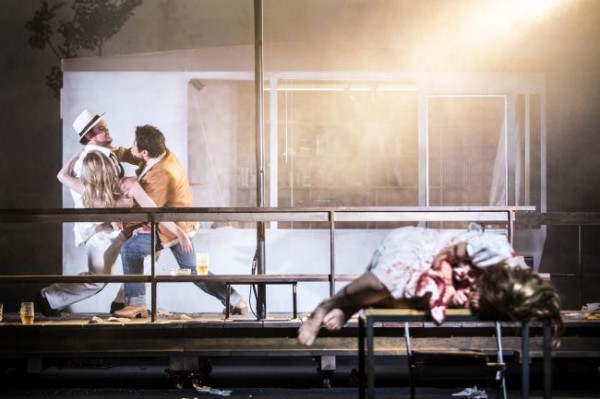 der letzte Mord: James Homan (Der Fremde), Adela II (stumm), Namwon Huh (Ramón); vorne liegend: Irena Simmes (Adela)