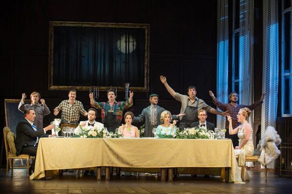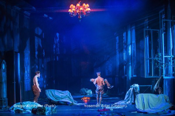 Regisseur Immo Karaman hat eine reiche Britten-Erfahrung – und man kennt ihn in Klagenfurt seit 2014 mit einer intellektuell-bunten Inszenierung von Prokofjews „Liebe zu den drei Orangen“. Wie bei Prokofjew arbeitete er wiederum mit dem Choreographen Fabian Posca zusammen – diesmal in der Bühnen- und Kostümausstattung von Nicola Reichert. Die Traumgeschichte ist in das Kaminzimmer eines zu einem Geisterhaus gewordenen englischen Manor House verlegt und spielt offenbar in der Entstehungszeit von Brittens Werk. Hitchcock-Assoziationen werden wach: wallende Vorhänge vor großen offenen Fenstern und Titania ganz in Weiß im Grace-Kelly-Look – Hitchcocks „Dial M for Murder“ (Bei Anruf Mord) stammt aus dem Jahre 1954. Bei Shakespeare spielt der Sommernachtstraum in Athen und das ist nicht das historische, sondern das Athen der Poesie, dem freilich einige Farben des Shakespeareschen London beigemischt sind – warum also Brittens Sommernachtstraum nicht im England der Mitte des vorigen Jahrhunderts ansiedeln ?! Der kluge Berliner Theaterwissenschaftler und Dramaturg Han-Jochen Irmer schrieb einmal zum Sommernachtstraum: „Zeit der Handlung – jede Gegenwart, die fähig ist, sich auf diese Handlung einzulassen.“ Und die Klagenfurter Inszenierung hat sich schlüssig und bühnenwirksam auf die Traumwelt der Gefühlsverwirrungen eingelassen – ja sie hat die Gefühlsverwirrungen zwischen Mann und Frau noch erweitert: ganz offensichtlich bestehen nämlich auch zwischen dem Elfenkönig (Ziegenbock) Oberon und seinem – lustvoll gezüchtigten – Diener (Jungböcklein) Puck beträchtliche Gefühlsverwirrungen – dazu ist auch noch die Figur des Puck gleichsam verdoppelt durch den Knaben, der der Ausgangspunkt für den Streit zwischen Oberon und Titania war. Nicht dass diese gleichgeschlechtlichen Gefühlsspannungen ungebührlich oder allzu vordergründig dargestellt werden, aber sie werden deutlich spürbar, zum Beispiel wenn Oberon den Knaben in seinen Armen von der Bühne trägt und Puck allein zurückbleibt.