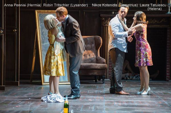 Die für Klagenfurt zusammengestellte Solistenbesetzung war sehr gut – es war eine geschlossene Ensembleleistung ohne Schwachpunkt. Anna Pennisi (Hermia) und Nikos Kotenidis (Demetrius) hatte man schon als Dorabella und Guglielmo in der Eröffnungspremiere dieser Saison kennengelernt. Sie überzeugten auch bei ihrem Britten-Debut – Anna Pennisi mit warmem und ausgeglichenem Mezzo, der sich auch in den Ensembles mühelos behauptet – Nikos Kotenidis mit kräftig auftrumpfendem virilen Bariton. Laura Tatulescu hatte man im Vorjahr als berührende Blanche in den Dialogues des Carmélites erlebt – diesmal war sie eine energische Helena mit sicherer Stimmführung. Neu für Klagenfurt war der irische Tenor Robin Tritschler , der als Lysander eine ideale Besetzung war – mit klarer stimmlicher (und natürlich auch textlicher) Artikulation führte er das Quartett an. Bei allen vier war zu erleben, wie wunderbar Britten für Stimmen komponiert hatte – das Quartett mit den ansteigenden Oktavphrasen im 3.Akt war ein Musterbeispiel englischer Kantilene.