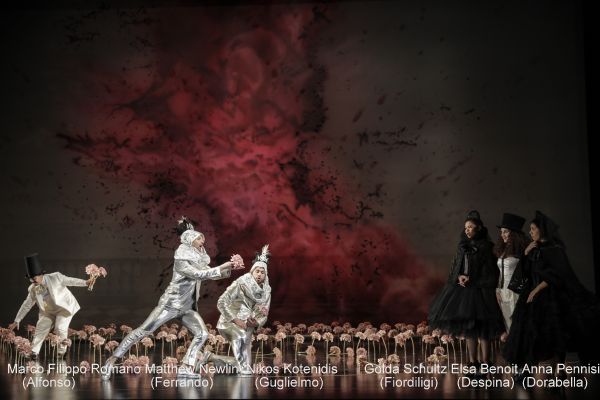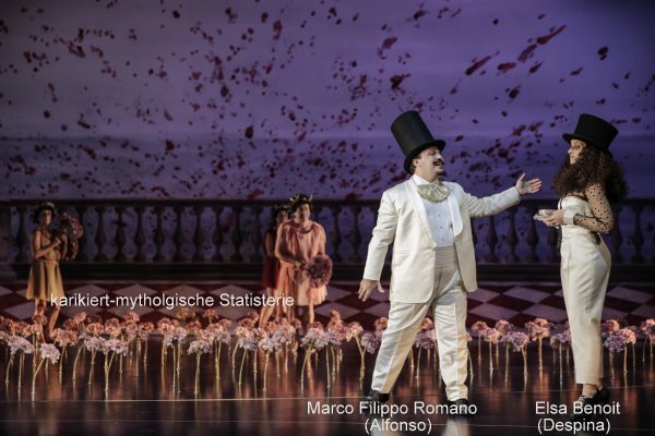 Der aus Griechenland stammende spielfreudige Guglielmo von Nikos Kotenidis überzeugte mit seinem warmen Bariton. Despina war die Französin Elsa Benoit – von Beginn an als Drahtzieherin des Geschehens omnipräsent. Sie erwies sich als prägnant-charmante Darstellerin mit einem sicheren, ein wenig herb klingenden Sopran. Kotenidis und Benoit werden im Laufe dieser Spielzeit in weiteren Rollen in Klagenfurt zu erleben sein. Don Alfonso war beim Italiener Marco Filippo Romano in besten Händen. Er spielte glaubhaft den „Direktor“ des ganzen Spiels und sang in bester italienischer Rossini-Tradition mit markant-plastischem Bariton.