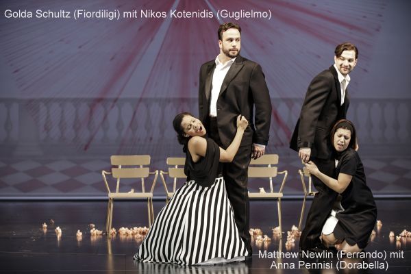 Klagenfurt hat für die sechs Protagonisten ein homogenes und junges Solistenteam zusammengestellt, von dem man annehmen darf, dass alle ihren Weg machen werden. Eine von ihnen hat ja sogar schon den großen internationalen Durchbruch geschafft: Golda Schultz war vor zwei Jahren Klagenfurts Entdeckung als Sophie im Rosenkavalier – nach München hat sie die Sophie nun auch in diesem Sommer bei den Salzburger Festspielen gesungen und ihr Scala-Debut als Susanna steht 2016 bevor. Die Fiordiligi wird sie nach ihrem Klagenfurter Rollendebut ab November auch in München singen. Ich hatte an diesem Abend speziell im 1.Akt den Eindruck, dass diese Rolle für sie noch zu früh kommt. Natürlich verfügt Schultz über eine natürliche Bühnenausstrahlung und über eine sehr sicher sitzende und individuell gefärbte Stimme, aber im 1.Akt – speziell in der großen „Come scoglio“-Arie fehlte mir ein wenig der große Legato-Bogen, aber auch die nötige artifizielle Primadonna-Souveränität. Wunderbar gelang ihr dann allerdings im 2.Akt die Szene „Ei parte“ mit dem Rondo „Per pietà, ben mio“ – das war berührend und wirklich auf hohem interpretatorischen Niveau. Ihr Schwester Dorabella verkörperte die Italienerin Anna Pennisi. Mit ihrer warm-timbrierten Stimme war sie eine ausgezeichnete Besetzung, die auch in allen Ensembles immer markant präsent war. Und man freute sich, dass sie auch die oft gestrichene Arie „E amore un ladroncello“ singen durfte. Sie ist zweifellos ein großer Gewinn für Klagenfurt und man kann gespannt ihre weiteren Auftritte erwarten: die Hermia in Brittens Sommernachtstraum, die Suzuki in Madama Butterfly (damit war sie eben in Rom erfolgreich) und den Romeo in „I Capuleti e i Montecchi“. Aber auch die Herrenpartien waren sehr gut besetzt. Der amerikanische Tenor Matthew Newlin war ein wahrhaft ausgezeichneter Ferrando. Im 1.Akt war er mit seiner großen Arie „Un aura amorosa“ der einzige der vier jungen Liebesverwirrten, der auch die ernste Seite der Figur musikalisch und darstellerisch überzeugend erleben ließ. Sein Terminplan ist mit großen lyrischen Rollen in Berlin ausgefüllt – und so wird man ihn leider wohl nicht so bald wieder in Klagenfurt erleben können.