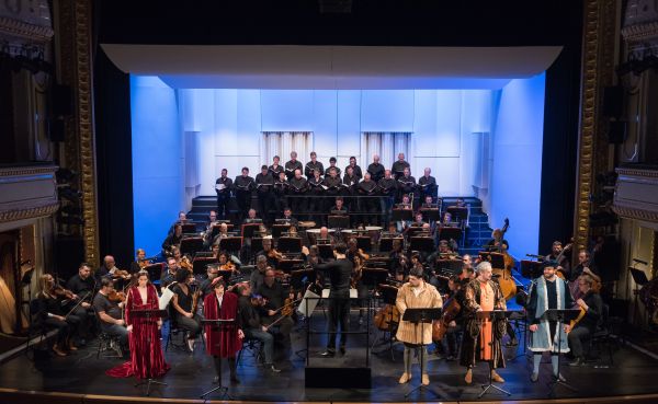 Der Orchestergraben war überdeckt, die Solisten standen ganz vorne unmittelbar vor der ersten Parterre-Reihe. Sie standen damit schon außerhalb des Bühnenraums, sozusagen direkt im Zuschauerraum. Damit fehlte ihnen der akustische Raum und Rückhalt, den sonst die Bühne bietet. Die Stimmen waren isoliert und fügten sich nicht in den Klang des Orchesters. Ich bin überzeugt, dass sich ein einheitlicheres Klangbild hätte entwickeln können, hätte man den Chor nicht auf der Bühne hinter dem Orchester aufgestellt, sondern ihn in den Seitenlogen positioniert. Damit hätte das Orchester auf der Bühne weiter nach hinten rücken können und die Solisten wären dort gestanden, wo erfahrungsgemäß für sie die beste Akustik ist und die beste Mischung mit dem Orchesterklang erzielt wird, nämlich im Bühnenportal.