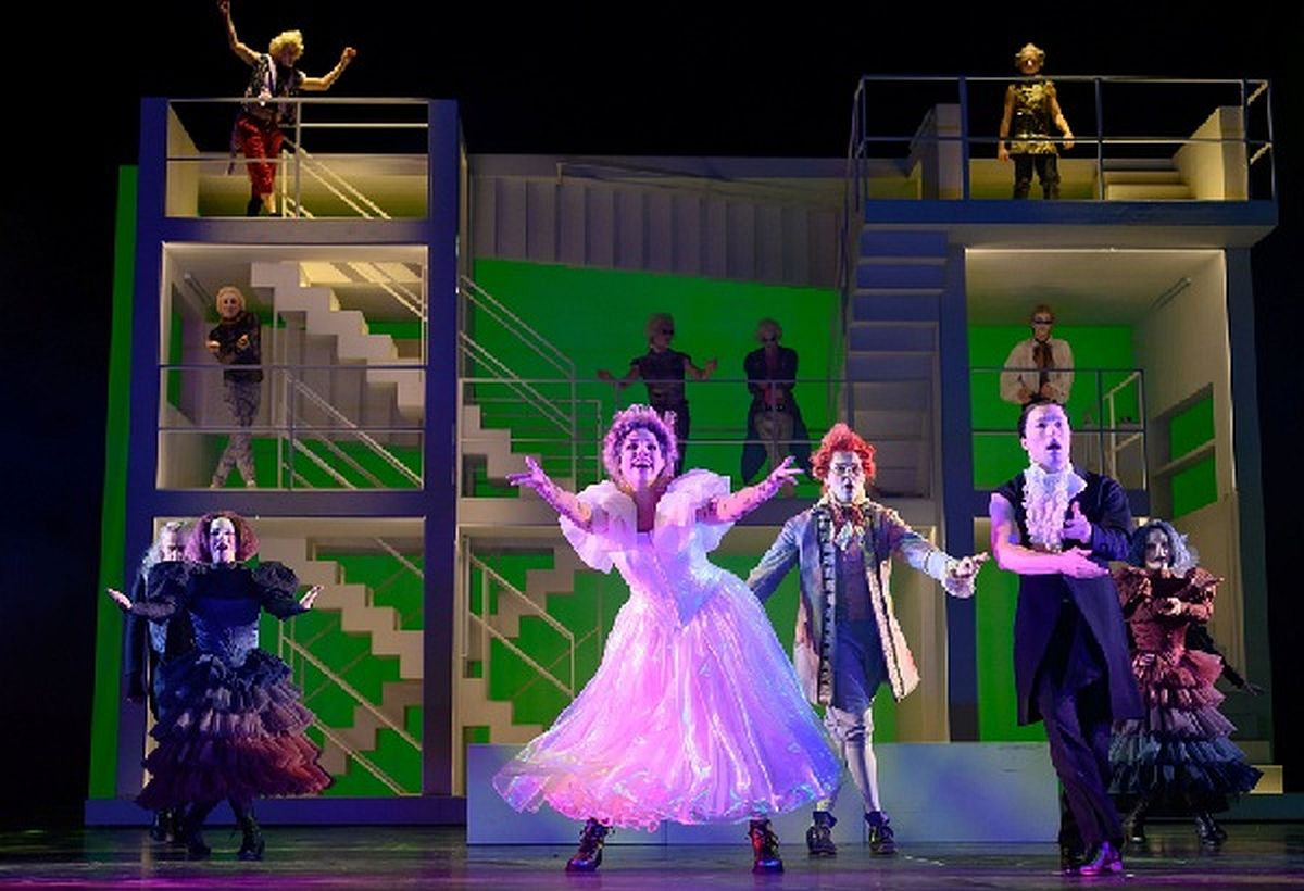 Andererseits steht auch die Inszenierung (Andreas Baesler) im überzeugenden Einklang mit Musik und Text; der Bühnenaufbau von Harald B. Thor ist ein weißes, Escher-artiges Konstrukt von Stiegen und Geländern, das je nach Bedarf entlang der Bühnentiefe verschoben wird und mittels Lichts zusätzliche Bedeutung erhält. Tanja Hofmann schuf die Kostüme, schrill, bunt und humorvoll, mit mehr als nur einem Seitenblick auf Alice in Wonderland. Yuko Haradas Choreografie schließt auch die Hauptrollen mit ein und schenkt dem Tanzsextett eindrückliche Auftritte. Eindrucksvoll die Videogestaltung (FH Hagenberg): Katharina Arbeithuber, Lisa Bayr, mit Nils Gallist und Philipp Ludwig Stangl – Konkretes und Abstraktes, Katastrophales und Schönes, immer in Einklang mit Handlung und Stimmung der Musik. Dramaturgie: Christoph Blitt und Johanna Würth, mit aufschlussreichem Programmheft.
