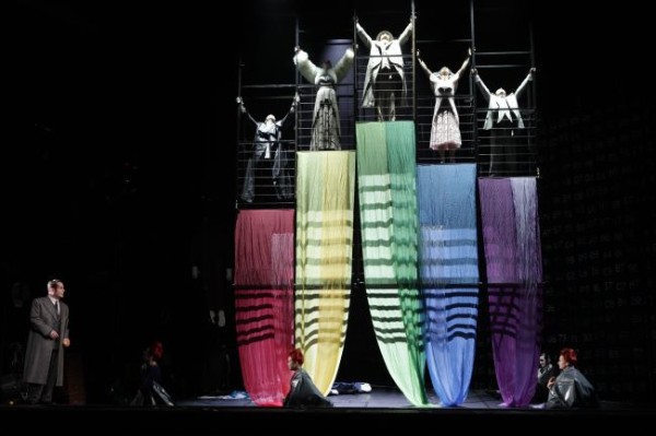 Heyme ist ein Meister seines Fachs, der seine Sänger hervorragend zu führen versteht und den szenischen Spannungsbogen konsequent durchzieht. Dass er kein altbackenes Märchen auf die Bühne bringen, sondern das Geschehen in einem zeitgenössische Rahmen ansiedeln würde, war zu erwarten. Indes geht es ihm nicht um eine vordergründige Aktualisierung, sondern gleichsam um eine Modernisierung von innen heraus. Einfühlsam stellt er die Frage, welche Relevanz den mythischen Wurzeln des Werkes für unsere Gegenwart noch zukommt. Es ist großes Welttheater, das Heyme auf die Bühne stellt und politisch-gesellschaftliche Probleme einfühlsam mit einem bürgerlichen Familiendrama Strindberg’scher Prägung verbindet. Bei seiner ausgeprägten Kritik an der kapitalistischen Wohlstandsgesellschaft, deren Auswüchse bereits zu Beginn eine Verschmutzung des Rheines nach sich gezogen haben – der Ansatz von Robert Carsen in Köln war ähnlich -, lässt sich der Regisseur auch von den Erkenntnissen eines George-Bernard Shaw leiten, dessen Postulat „ dass es sich bei dem ‚Ring’ um ein „Drama der Gegenwart und nicht um eines aus ferner und sagenhafter Vorzeit“ handele“, für ihn nur zu wahr ist. Im Zentrum seiner Interpretation steht Wotan, Paradebeispiel eines Machtmenschen, der sich durch seinen Urfrevel an der Weltesche an der Natur versündigt hat, was eine unaufhaltsame zerstörerische Kettenreaktion nach sich zieht, die unsere Umwelt immer mehr schädigt. Dieser Prozess setzte bereits zu Wagners Zeit ein, diese Thematik war damals mithin genauso aktuell wie heute. Der Versuch des hier noch jungen Göttervaters, den Erdkreis durch Verträge zu binden und zu zivilisieren, beruht auf Sünde und Verbrechen. Wo die Wurzeln verdorben sind, ist aber die Auflösung schon vorprogrammiert. Das ist einer der Grundaussagen Heymes, die für jedes Zeitalter zutrifft. Wotans Speer dient nicht mehr länger dem Schutz des Vertragswesens, sondern wird nachhaltig zu einem Sinnbild des Makels degradiert, der alle Lebensbereiche erfasst.