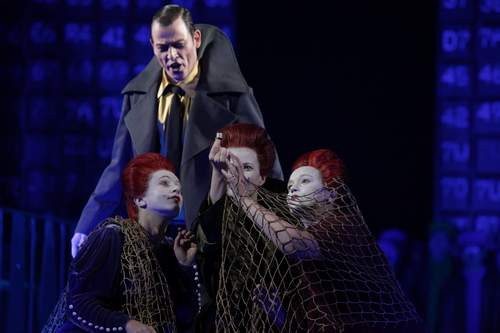 Ist diese Welt zu retten? Heyme, der – man mag das für „Altersweisheit“ halten – weniger auf politische Eindeutigkeiten als auf menschlich diffizile Verhältnisse setzt, geht den mit dem „Rheingold“ angelegten Weg konsequent weiter: noch kurz vor Schluss ziehen sie Siegfried die Schuhe aus, um sie in einem der vielen Asservatenkästen zu deponieren: auch er einen Nummer unter den namenlosen Toten. Es war nur der Vor-Schein einer Hoffnung: die Sterne, die in der Abschiedsszene des Vor-Spiels die düstere Mauer romantisieren – doch schon zuvor war das Seil des Wissens gerissen: wobei das Flackern des letzten Lichts auch den Zuschauerraum, also uns selbst schlaglichtartig erleuchtete. Heyme gelang es – und dies ist eine der großen Leistungen dieser „Ring“-Deutung – den Mythos mit der Moderne zu versöhnen. Nornen, Rheintöchter, Götterwesen – sie haben ihre Auftritte, um als surreale Fremdkörper nicht zu stören, sondern fantasievoll zu irritieren. Grane, die Figuration Wotans, hat einige längere Sequenzen: ein Mensch mit Pferdekopf und Vogelflügeln, der im erhofften Feuer der Reinigung untergehen wird. Wenn Brünnhilde schließlich Wotans Raben gen Walhall schickt, dann sehen wir tatsächlich zwei Raben – und zwei schwebende Wesen, die zwischen Erde und Himmel vermitteln. Sind es schon die Seelen von Siegfried und Brünnhilde?