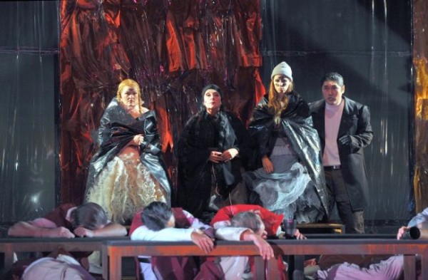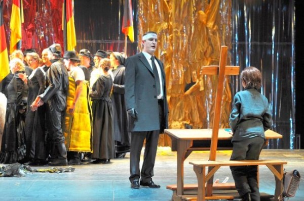 Leider stand es gesanglich nicht zum Besten. Adelheid Fink stürzte sich mit viel Elan und einer enormen darstellerischen Kraft in die Rolle der Regina, der sie schauspielerisch sehr gerecht wurde. Gesanglich schnitt sie insgesamt ebenfalls solide ab, neigte in der Höhe aber manchmal zu einer etwas scharfen Tongebung. In diesem Bereich wäre mehr stimmliche Anlehnung erforderlich gewesen. Für Daniel Ohlmann erwies sich die Partie des Richard als zu hoch. In der Mittellage mit durchaus angenehmem Tenor solide singend, stieß er bei den oft angestrengt klingenden Spitzentönen hörbar an seine vokalen Grenzen. Einen zwiespältigen Eindruck hinterließ Daniel Henriks als Stephan. Von seinem Äußeren her gut gewählt und auch trefflich spielend, war er in gesanglicher Hinsicht nicht in gleichem Maße überzeugend. In einigen gefühlvollen und bedächtigen Passagen seiner Arie „Was sprach der alte Tor?“ im ersten Akt war er recht schön anzuhören. Da wies sein Bariton einen ordentlichen Sitz auf, was im Übrigen leider nicht immer der Fall war. Seine Stimme saß manchmal ziemlich im Hals, was insbesondere bei den dramatischen Stellen der Fall war. Nur über dünnes Tenormaterial verfügte der nicht gerade gut focussiert singende Kilian von Daniel Kim. Das gilt auch für Daniel Ewalds Freischärler. Die stark abgesungene Geertje Nissen bewältigte die Barbara nur noch mit wenigen Stimmresten. Ordentlich gab Daniel Böhm den Wolfgang. Die besten Leistungen des Abends erbrachten der über wunderbares sonores Bassmaterial verfügende Christoph Stegemann, der ein noch ziemlich jung anmutender Simon war, und die die Beate mit ebenfalls bester italienischer Technik singende Ludovica Bello. Das Kind gab Tabea Floch. Ordentlich schnitt der von Ulrich Nolte einstudierte Chor ab.