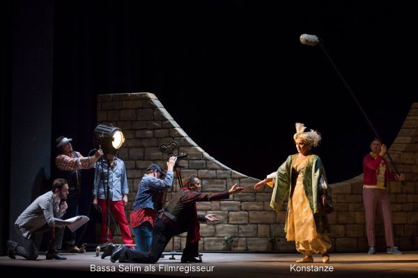Bassa Selim war der erfahrene und sich profiliert präsentierende Marburger Schauspieler Ivica Knez – und diese Figur war auch die Schlüsselfigur des szenischen Konzepts, für das der deutsche Regisseur Bruno Berger-Gorski gemeinsam mit dem Bühnenbildner Marko Japelj und dem Kostümgestalter Luca Dall’Alpi verantwortlich zeichnete. Das Stück beginnt zunächst in altmodischer Stadttheater-Tradition als recht konventionelles Kulissentheater, bis nach dem Janitscharen-Chor (Nr. 5 der Partitur) der Bassa auftritt und sich als ein Filmemacher erweist, der offenbar ein Auge auf seine Hauptdarstellerin Konstanze geworfen hat und sich deutlich als etwas Besseres fühlt als seine Provinztheater-Truppe. Mit seinem Filmteam arrangiert er jede Gesangsszene – offenbar meinte der Regisseur, dass die zahlreichen Arien zu statisch seien, und dass alles mit krampfhaft gestellten Filmszenen verfremdet werden müsse. Außerdem muss das Ganze im Filmstudio Istanbul spielen, damit man möglichst viele muslimisch gekleideten Menschen, verschleierte Haremsdamen, und auch eine Gebetsszene einbauen kann. Und natürlich muss auch immer wieder ein Team von Kopftuch-Putzfrauen auftauchen, das zwischen den einzelnen Szenen die Bühne reinigt und sich über die gespielt-gefilmten Szenen wundert und erheitert.