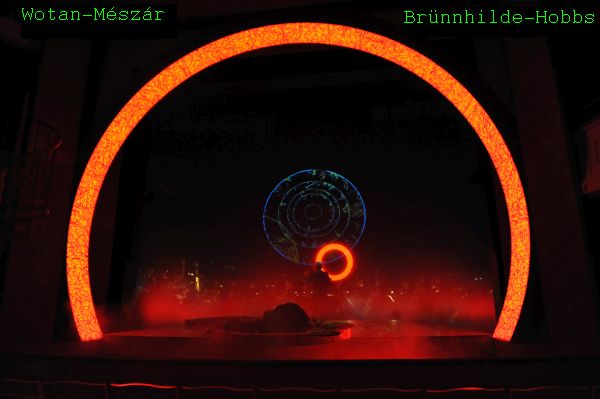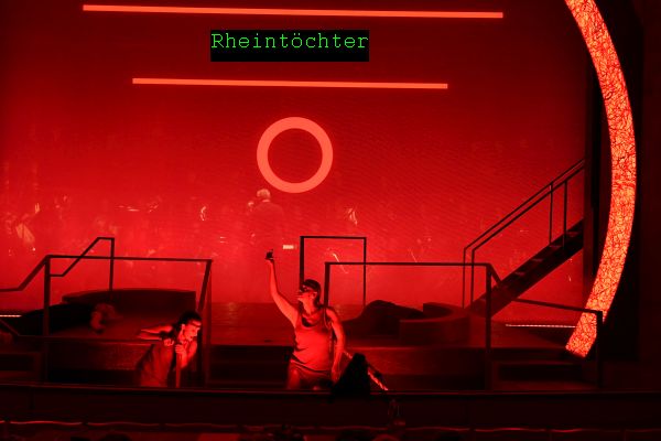 Als am meisten Leidtragende und Hauptakteurin behielt einzig Brünnhilde ihr leuchtend – rotes Kleid bei allen ihren Auftritten bei bis auf ein weisses Hochzeitsgewand für die kurze Zeit als Gunthers Braut. Auch die über der Bühne auf dem Gazevorhang gezeigten Videos von Matthias Lippert zeigten eine ähnliche Entwicklung. Die zeigten ausser dem bis zum Schluß immer wieder aufleuchtenden Ring erklärende Motive wie Stacheldraht, Spinnen, Hunde und Pferde, fallende Felsbrocken oder Regenbogen bis zu Algorithmen (vielleicht auch Runen?) zu Beginn der Götterdämmerung.