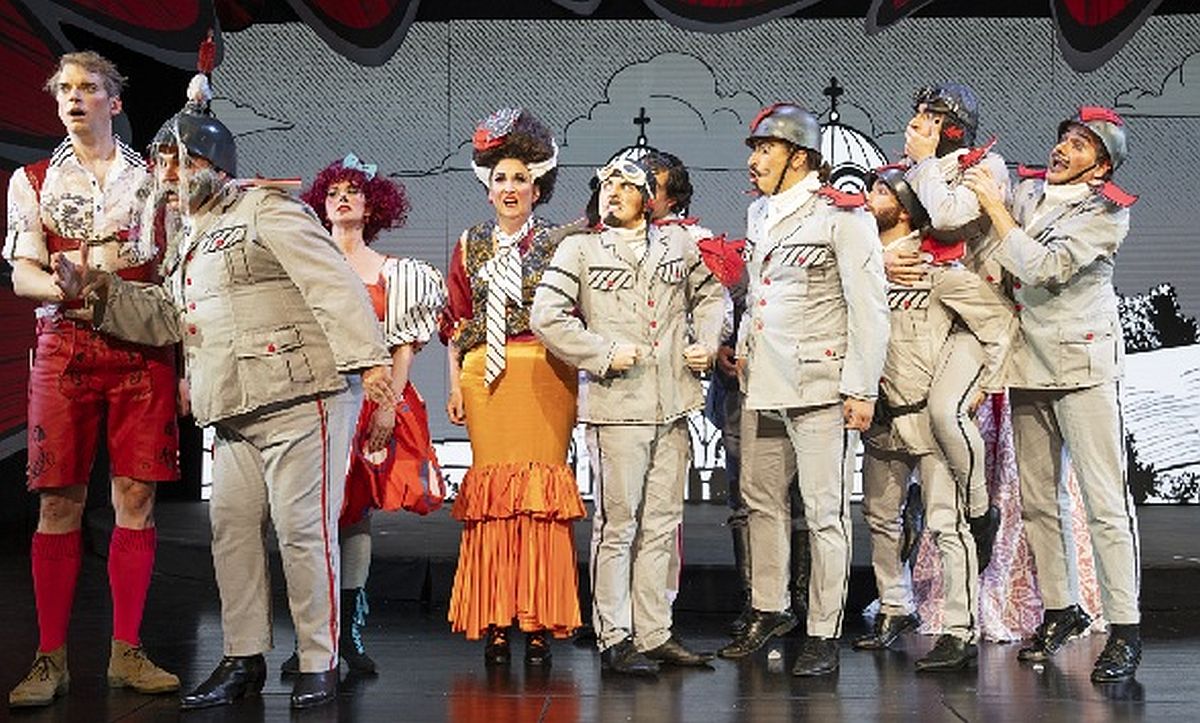 Zu Beginn gehen die Protagonisten davon aus, der „tapfere“ Major Alexius Spiridoff (Lukas Johan, Bariton), verlobt mit Nadina Popoff (Lena Stöckelle, Sopran), habe „dem Feind“ eine empfindliche Niederlage beschert, was keiner dem lächerlich gezeichneten eitlen Tölpel abnehmen würde, nicht einmal die anfangs gutgläubige potenzielle Schwiegermama Aurelia (Christa Ratzenböck, Mezzo). Dass sich der Schönling weit mehr für die schlagfertige Mascha (Jasmin Bilek), als für seine Braut interessiert, wird schließlich dabei helfen, den Knoten zu entwirren „wer mit wem“ idealiter verbandelt ist oder sein sollte.
