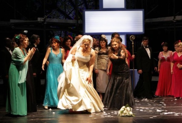 Hier dämmert eine neue Demokratie herauf, die Ortrud als letzte Repräsentantin der alten Ordnung auf jeden Fall verhindern will. Bei Widder ist sie entsprechend Wagners ureigenstem Postulat ein „politisches Weib“, das die Masken ihrer alten Götter Wotan und Freia im Gepäck mit sich führt. Ihr dunkles Kleid reflektiert das Wesen ihrer Seele. Bei der Münsterszene des zweiten Aufzuges, die von einem riesigen stilisierten Kreuz, vor dem ein Bischof niederkniet, dominiert wird, erscheint sie als schwarzer Schwan, während Elsa im Brautkleid als weißer Schwan zur Hochzeit geht – eine gelungene Anspielung auf Tschaikowskys „Schwanensee“, die indes nicht mehr neu ist. Das hat man in Bayreuth bei Hans Neuenfels auch schon so gesehen – desgleichen, dass Telramund als innerlich schwaches, leicht manipulierbares Werkzeug Ortruds erscheint. Widder und Surowiec lassen ihn im braunen Straßenanzug agieren und sehen ihn wohl als rechtsgerichteten Parteiführer.