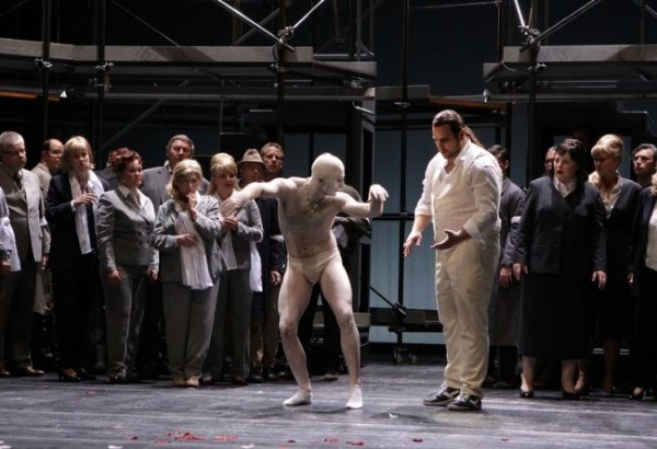 Die Farbe Braun legt den Schluss nahe, dass der Regisseur an der Figur des brabantischen Grafen, der hier gleich Hitler aus der Mittelklasse stammt, als Vehikel für den im Hintergrund bereits aufdämmernden Nationalsozialismus benutzt. Ganz deutlich wird Widder dabei indes nicht, sondern belässt es bei einer dezenten Andeutung. Genauso geht er bei Elsa vor, bei deren gänzlich unkonventionellem, aus einem wildbunten Rock bestehendem Outfit man ohne weiteres auf den Gedanken kommen könnte, dass sie weniger eine Herzogstochter als vielmehr eine Angehörige der von den Nazis verfolgten Sinti und Roma sei. Aber auch diesbezüglich wird Widder nicht allzu deutlich und belässt es bei einem bloßen Fingerzeig. In diesen Punkten zeigt er sich eher vorsichtig, obwohl eine derartige Interpretation mit Blick auf die Rezeptionsgeschichte des Werkes und den Missbrauch, den die braunen Machthaber gerade mit ihm bei den Bayreuther Festspielen 1936 getrieben haben, durchaus legitim wäre. In diesem politisch geprägten Ambiente würde ein echter Schwan reichlich deplatziert wirken. Darüber ist sich Widder im Klaren. Aber auch dafür hat er eine überzeugende Lösung gefunden: Er zeigt ihn als von dem Tänzer Davide Degano dargestellten, fast nackten und glatzköpfigen Jüngling, der sich in wunderbar choreographierten Bewegungen ergeht und dabei auch etwas doppeldeutig wirkt. Diese Sichtweise ist dann beim Publikum auf große Zustimmung gestoßen, wie auch die ganze Produktion, zu der man Wolf Widder nur gratulieren kann.