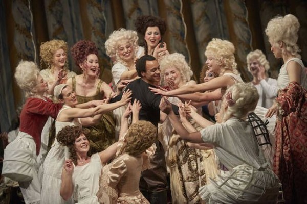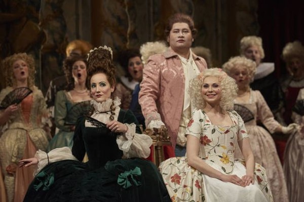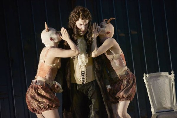 Von einer solchen Mentalität ist das heutige Musikleben weit entfernt. Händels Oratorien haben sich in den vergangenen Jahren zunehmend auch den Weg auf die Opernbühne erobert. Und bei „Saul“ war das Ergebnis besonders bemerkenswert, denn Lydia Steier hat das Werk als packendes, gut durchdachtes und geistig-innovativ hochkarätiges Musiktheater auf die Regensburger Bühne gebracht. Dabei hat sie den Zuschauer in Zusammenarbeit mit Katharina Schlipf (Bühnenbild) und Ursula Kudrna (Kostüme) zuerst ganz schön an der Nase herumgeführt. Wenn sich der Vorhang öffnet, erschließt sich dem Blick ein recht traditionelles Barock-Ambiente: Guckkastenbühne, Seitengassen, elegante Polstersessel, ausladende Reifröcke und Allonge-Perücken. Eine im Verfall begriffene, reichlich dekadent wirkende, wenn auch prächtig gekleidete Barock-Gesellschaft hat sich hier versammelt und harrt der Dinge, die da kommen werden. Auf wolkigen Höh’n thront Saul als Ludwig XIV – ein recht kitschiger Anblick. Wenigstens darf er das auf einem Theater auf dem Theater tun, womit bereits in diesem reichlich altbackenen Rahmen ein Stück Brecht hereinspielt.