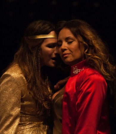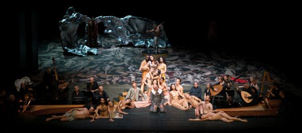 Da sich die Regie also in erster Linie auf die Tänzer konzentrierte, eine Fragen zu dem, was die Sänger zu tun hatten: Warum verkleidete sich Ottone nicht mit Drusillas Kleidern, um seinen Anschlag auf Poppea durchzuführen? Einige Momente waren geglückt, so etwa der Reigen, an dem die selig verliebte Drusilla teilnimmt, und besonders beeindruckend die Skulptur aus nackten Menschen, die wie eine Barockplastik die schlummernde Poppea umgaben. Der Sinn dessen, dass die Götter als Krüppel dargestellt wurden (eine weitere dem Programmheft entnommene Offenbarung), hat sich wohl nicht nur mir nicht erschlossen, ebenso wenig die Videos mit Grimassen schneidenden Mitwirkenden zu Beginn. Überzeugend hingegen die Mimik aller Mitwirkenden beim Schlussduett „Pur ti miro“, die sich zunächst schieflachen über dieses unwahrscheinliche Idyll, um dann in Angst vor kommenden Untaten Neros zu verfallen. Bei den Kostümen durften sich Lemm&Barkey austoben: Am wenigsten geglückt wohl die Kleidung Neros, die an einen jugendlichen Winnetou erinnerte.