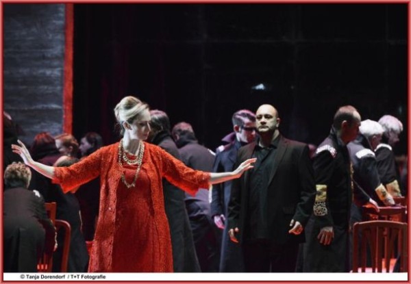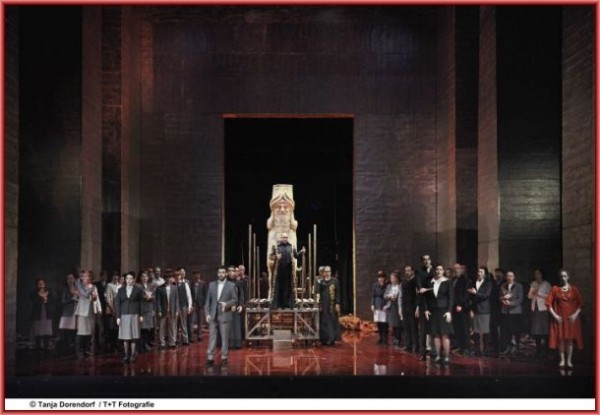 Über die Inszenierung von Emilio Sagi würde man eigentlich gerne den Mantel des Schweigens ausbreiten – sie findet schlicht nicht statt. Dieser NABUCCO ist eine Koproduktion der Ópera de Oviedo, des Teatro Jovellanos de Gijón, des Theaters St. Gallen, des Baluarte de Pamplona und des Teatre Principal de Palma. Die Premiere fand im Oktober 2015 in Oviedo statt. Der Einheitsbühnenraum von Luis Antonio Suárez mit seinen wuchtigen Mauern wäre durchaus brauchbar für eine Inszenierung des NABUCCO, auch die Lichtgestaltung von Eduardo Bravo und Alfonso Malanda ist stimmungsvoll. Was gar nicht überzeugte, waren die hässlichen und die Protagonisten überaus unvorteilhaft erscheinen lassenden Alltagskostüme von Pepa Ojanguren. Doch selbst darüber hätte man noch hinwegsehen können, wenn auf der Bühne etwas erzählt worden wäre. Dem war nicht so. Unbeholfenes Herumstehen, Teilnahmslosigkeit (Abigaille stets mit verschränkten Armen und Blick nach unten…), von Personenführung oder Charakterisierung keine Spur. Zur Ouvertüre strömen nach und nach Menschen auf die Bühne, lesen die hebräischen (?) Schriftbahnen wie im Museum und scheinen sich dann so in die Geschichte hineinzuleben. Der Ansatz wäre eigentlich nicht schlecht, um die Allgemeingültigkeit von Selbstüberhebung, Religionsfanatismus und deren Auswirkungen zu unterstreichen. Was dann aber folgt ist irgendwie Laientheater, mit den peinlichen Höhepunkten des ersten Auftritts Nabuccos im Tempel und des Hantierens mit einem roten Zwischenvorhang während des Gefangenenchors. Als Zuschauer vermag man keine Empathie mit den Protagonisten zu empfinden, die Geschichte findet keinen dramaturgischen Bogen. Schade und ärgerlich!