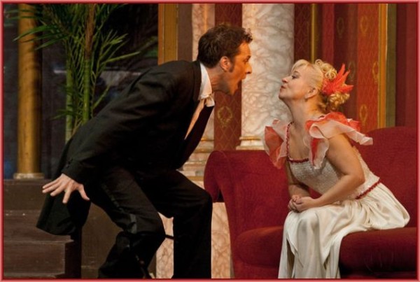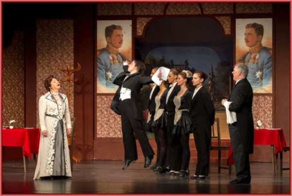Es ist eine schmissige und schwungvolle Operettenaufführung, an der es praktisch nichts auszusetzen gibt. Sowohl szenisch als auch musikalisch kann man eine Operette erleben, wie sie leider nur noch selten aufgeführt wird. Als Csárdásfürstin Sylva Varescu steht mit der Wienerin Kerstin Grotrian eine lebendige und stimmschöne Sopranistin auf der Bühne. Ein bisschen fehlt ihr zu Anfang gerade beim feurigen Csárdás das leidenschaftliche Feuer. Stimmschön, mit warmem und weichem Sopran, kann sie jedoch weiter entzücken und die ungarische Leidenschaft kommt halt ein bisschen später. Nun wird sie immer besser, fast könnte man sagen, sie singt sich warm, um dann auch in den Duetten mit ihrem Edwin zu glänzen. Insgesamt gesehen eine sehr gute, auch mit viel Beifall versehene Leistung. Als Edwin steht der junge blonde gutaussehende Österreicher Stefan Reichmann auf der Bühne. Er besitzt einen strahlenden, höhensicheren Tenor, den er mühelos einsetzt, vielleicht ihn manchmal etwas zu sehr schont. Aber wo hat man noch einen so blendend aussehenden und auch vorzüglich spielenden sympathischen jungen Tenor. Ich freue mich, dass man wieder einmal einen tenoralen Hingucker und Hinhörer besitzt. Beim Buffopaar bin ich etwas gespalten. Da ist einmal die ewig junge Susanne Hellberg als Komtesse Stasi, die über die Bühne wirbelt, als wäre das ihre eigentliche Berufung. Leidenschaftlich, voller Feuer und Temperament gibt sie alles und auch stimmlich bekommen wir eine überdurchschnittliche Leistung zu sehen und zu hören. Man fragt sich, wo diese kleine, zierliche Person dieses ganze Feuer herholt und freut sich dann doch, dass sie es besitzt und damit ihr Publikum begeistert. Zusammen mit ihrem Bühnenpartner, dem aus Slowenien stammenden David Hojsak als Graf Boni sind sie die eindeutigen Lieblinge des Publikums. Darstellerisch und tänzerisch weiß David Hojsak vollstens zu überzeugen, er bringt eine überaus sympathische Rollengestaltung auf die Bühne. Was mir leider fehlt, ist ein bisschen die Stimme, da ist er für mich einfach zu schwach, zu untergewichtig und selbst bei zurückgenommenem Orchester schwer verständlich. Ich weiß, dass das Publikum dies an diesem heutigen Nachmittag ganz anders sieht, für mich bleibt er ein darstellerisch, gestalterisch und tänzerisch überdurchschnittlicher, stimmlich – momentan – leider etwas untergewichtiger Darsteller. Das Publikum mitreißen kann er jedoch schon vorzüglich. Auf jeden Fall sind beide ein toll aufeinander eingestimmtes Buffopaar, bei dem es einfach Spaß macht zuzuschauen.
