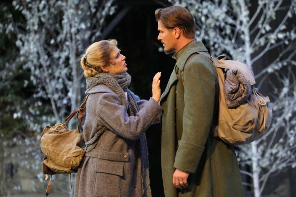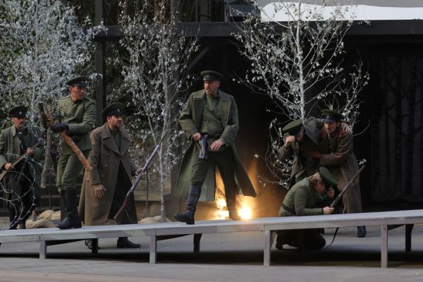 Die Inszenierung Ulrich Wiggers konzentriert sich sehr auf die Verflechtungen der Protagonisten und überzeugt durch eine gute Personenregie. Dazu gelingen ihm einige ins Mark gehende Bilder von der Kriegsfront, weswegen das Stück auch ausdrücklich mit einer Besuchsempfehlung ab 12 Jahren versehen wurde. Weitere größere Anspielungen sind aber nicht ersichtlich, so bleibt das Werk hier vor allem eine große und tragische Liebesgeschichte. Beim Bühnenbild setzen Ulrich Wiggers (Konzeption) und Jens Janke (Realisation) vor allem auf eine angedeutete verschneite Winterlandschaft, nicht ganz einfach bei solchen sommerlichen Temperaturen wie derzeit. Dazu wird ein großer Steg immer wieder geschickt eingesetzt. Die Seitenbereiche der Freilichtbühne werden bei dieser Produktion mit Ausnahme eines Feldlazaretts gar nicht eingesetzt, dafür wird der Brunnen oft bespielt. Die Kostüme stammen wie in Tecklenburg üblich von Karin Alberti und sind erneut abwechslungsreich und sehr detailliert ausgearbeitet. Bei den großen Massenszenen kann auch die Choreografie von Zoltán Fekete gefallen. Das Orchester spielt unter der musikalischen Leitung von Tjaard Kirsch gewohnt souverän.