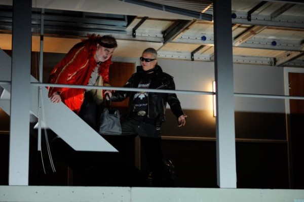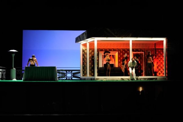 Herzöge, Hofnarren und Bravos gibt es der früheren Form zwar nicht mehr, aber der Stoff lässt sich mit seinen drastischen Zutaten fast 1:1 in die Gegenwart übertragen, die um nichts schmeichelhafter ist, sondern eher noch brutaler als ein historisches Tableau. Der Regisseur Bruno-Berger-Gorski, der inzwischen seinen fünften Rigoletto vorstellt, tut das in Trier mit drastischen Mitteln bis hin zur Brutalität, wobei er aber die Grenzen des „guten Geschmacks“ unangetastet lässt. Für sein gesellschaftliches Dreischichten-Modell hat ihm der Bühnenbildner Thomas Dörfler, Ausstattungsleiter am Pfalztheater Kaiserslautern, einen Architekturkomplex der Gegenwart errichtet, der im Verlauf von oben nach unten ergründet wird. Oben befindet sich das Attikageschoss mit Dachterrasse. Hier feiert der „Herzog“ mit seinen Speichelleckern eine Bunga-Bunga-Party. Außer dem Herzog in weißem Anzug sind alle in bizarre schwarze Fantasiekostüme mit viel Durchblick auf nackte Haut gekleidet (Kostüme: Gera Graf). Ihrem Gastgeber zuliebe mobben sie „diese oder jene“ und werden alle von Rigoletto gemobbt (mit Narrenkappe und rotem Mantel über grauem Unterhemd und Schlabberhose mit Hosenträgern) Es wird ganz klar: von dieser ausgelassen-dekadenten Feiergesellschaft hat noch nie jemand mit Kopf- oder Handarbeit ehrlich an der Steigerung des Bruttosozialprodukts gearbeitet. Die jugendlich-jungenhafte Erscheinung des „Herzogs“ legt nahe, dass er verzogenes Kind ist; schon in jungen Jahren scheint er sich aber trotz Dauerfete zu langweilen.