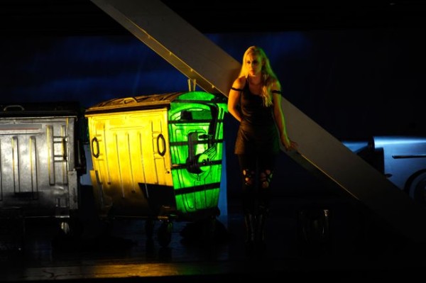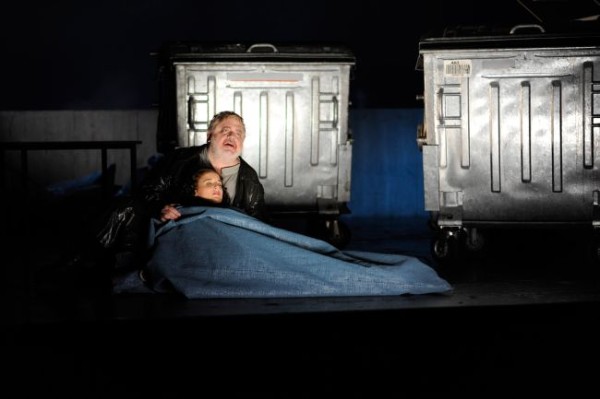 Praktischerweise in der Etage darunter lebt Rigoletto; im Treppenhaus begegnet er schicksalhaft Sparafucile: langes blondes Haar mit zum Pferdeschwanz gebunden, Springerstiefel, Sonnenbrille (auch im dunklen Flur). Sparfucile ist ein eingewanderter Mörder aus „Burgund“. Rigoletto erweist sich ebenfalls als Migrant: türkischer Muslim, der seine Tochter in seine heruntergekommene Wohnung eingesperrt hat. Hier darf sie vor dem Altar mit Bild der Mutter und roten Rosen ihren Gedanken nach Freiheit und Information nachhängen. „Lasst mich erfahren, wer meine Mutter ist.“ Im dritten Akt schließlich geht es in die unterste Etage der Gesellschaft: Straßenstrich in der Hofeinfahrt zwischen Müllcontainern. Äußerst brutal, bis zur Vergewaltigung springt hier Sparafucile mit seiner Schwester Maddalena um. In Projektion auf den Bühnenprospekt ziehen Gewitter und Starkregen auf, stroboskopisch beleuchten Blitze die Szene. Der „Herzog“ geht nicht nach Hause, sondern beobachtet die Szene bis zum traurigen Ende Gildas. Er ist tief betroffen. Hier setzt die Regie eine Art Erlösungsidee ein: „Colei sì pura, al cui modesto sguardo quasi spinto a virtù talor mi credo!“ (Sie, so rein, bei deren sittsamen Worten ich mich manchmal beinahe zur Tugend bewegt fühle!“) singt der Herzog zu Beginn des zweiten Akts. Aber eben nur beinahe! Hätte er durch Gilda auf den Weg der Tugend zurückgeführt werden können, oder hat Gilda durch ihr Opfer den Herzog gar erlöst? Aber sein zynisches „La donna è mobile“ intoniert der Herzog immerhin drei Mal! Dem Herzog auch nachdenkliche Züge zu verleihen, ist ein wichtiger Zug der Personenzeichnung, vom Regisseur schon in seiner Bonner Inszenierung von 2009 vorgenommen. Mit Gilda, deren Emanzipations- und Liebesversuch scheitert, bildet er so ein tragisches Opernpaar. Rigoletto und Sparafucile sind (aus unterschiedlichen Motiven) als Schurken ihre Gegenspieler. Maddalena ist ein weiteres Opfer. Wenn der Verdacht besteht, sie wolle nicht, dann wird sie mit Drogen gefügig gemacht – oder einfach „nur“ geschlagen. In einer solchen Konstellation braucht Rigoletto keinen Buckel. Gekonnte Personenregie und Chorführung mit viel individueller Bewegung runden das Bild einer durchwegs gelungenen Inszenierung ab, die wohl drastisch ist, aber nie provoziert und durchaus auch ganz klassische Bilder der Oper vermittelt.