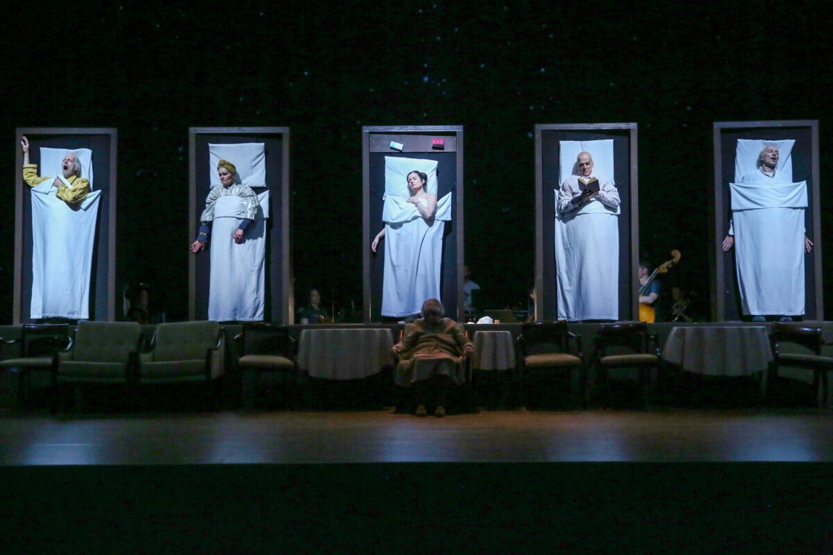 Johann Leutgeb überzeugte als Heribert Büxenstein, unterstützt von Horst Lamnek und Andreas Jankowitsch. Juliette Mars glänzte als Stella Sorell, Christa Stracke übernahm die stumme Rolle von Lotte Lange. Das Pflegepaar wurde von Ewelina Jurga und Vladimir Cabak humorvoll gespielt. Die Direktorin und der Hausarzt wurden von Maida Karišik und Dieter Kschwendt-Michel als berechnendes Anstaltspaar erschreckend verkörpert. Das Ensemble Phace, unter Leitung von Antanina Kalechyts, sorgte mit vielfältiger Instrumentation für musikalische Untermalung. Markus und Michael Liszt gestalteten die Bühne, während Nora Scheidl für passende Kostüme sorgte. Alexander Wanko übernahm die Lichtregie, Bärbel Strehlau entwickelte die Choreografie und Germano Milite ergänzte Videoprojektionen, die mich stark an die Animationen der Zauberflöte in der Volksoper erinnerten. Luisa Liebe schuf authentische Masken. Nach fast zwei Stunden erhielt das Ensemble begeisterten Applaus – auch der Rezensent applaudierte überzeugt mit.