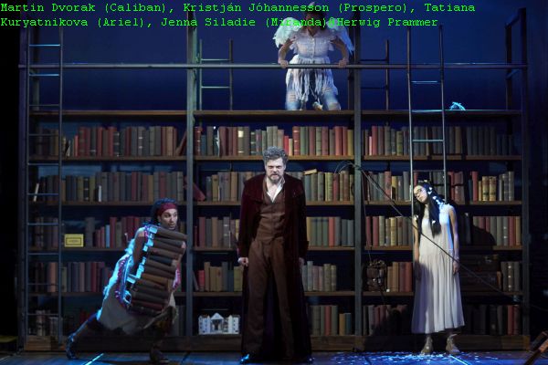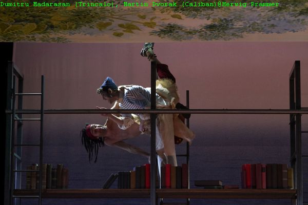Die Russin Tatiana Kuryatnikova als Luftgeist Ariel durfte ihren gut geführten Mezzosopran leider viel zu selten hören lassen und auch der rumänische Bass Dumitru Mădărăşan konnte seine Stimme nur selten vollends entfalten, da er als betrunkener Trincalo (drink-a-lot) stets einen Besoffenen mimen musste. Gemeinsam mit dem tschechischen Choreographen und Tänzer Martin Dvořák, der einen völlig durchgeknallten Caliban mit extremen körperlichen Verrenkungen darstellte, wirkten sie eher wie „Anhängsel“ dieser Produktion. Allen Mitwirkenden bis auf Prospero wurde beim Ersteigen der Bücherregale von der Regisseurin viel Beweglichkeit abverlangt. Und so wirkte ihre gesamte Personenführung auch bis ins letzte Detail perfekt durchchoreographiert.