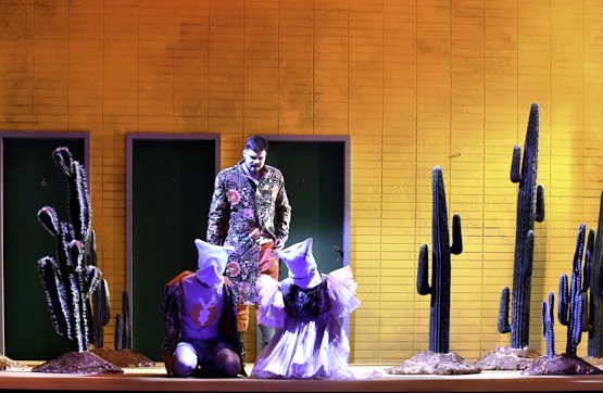 Das Konzept funktioniert also einigermaßen, und selbst, dass die Kostüme (Ausstattung: Adam Rigg) teilweise tatsächlich aus einer Barockoper stammen könnten, mag in einer Welt der Hippies stimmen. Und dass Glücksgöttin Fortuna hereinschwebt … Las Vegas ist ja gar nicht so weit. Kurz, man gewöhnt sich an die Motel-Umwelt, und trotz Übertitel (sie sind nicht immer gut zu lesen) kommt man ohnedies nicht hinter alle Geheimnisse der Handlung: Die ist nämlich schandbar kompliziert.