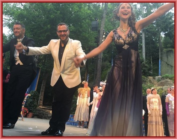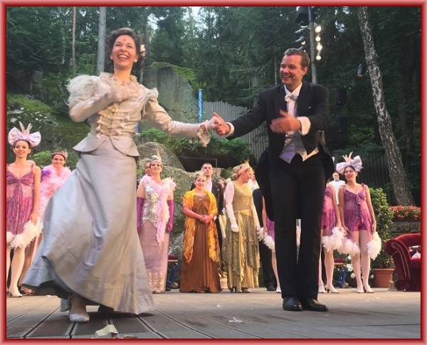 Die besuchte Vorstellung am Samstagnachmittag ist die erste, die ohne Unterbrechung durchgespielt werden kann, kein Tröpfchen Regen fällt, der kommt erst wieder am Abend, als mein Kollege in der Vorstellung sitzt. Und was für einen sensationellen Nachmittag erleben wir. Eine so schmissige mitreißend gespielte und gesungene Operette, habe ich schon lange nicht mehr erlebt, meine Mitfahrer schwärmen den ganzen Abend davon, als wir die Erlebnisse bei einem guten Essen noch einmal Revue passieren lassen können. An diesem Nachmittag hat einfach alles gepasst und bei solch grandiosen Aufführungen wird die so oft totgesagte Operette niemals sterben.