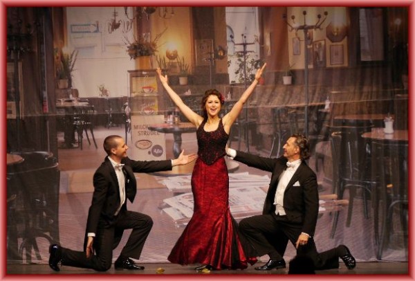 Die Sylva Varescu der Kerstin Grotrian „basste scho“, wie der Franke als Extremlob sagen würde: nicht überbordendes, aber nobles Temperament, gepaart mit einer eleganten und flexiblen Stimme, die die tückischen Höhen dieser Partie glänzend machte – eine Gestaltung, die niemals fürchten lassen muss, dass die Sängerin an stimmliche Grenzen kommt. Zusammen mit dem erstaunlich tiefliegenden Tenor des Stefan Reichmann, den die Regie leider ziemlich steif im Raum herumstehen und -gehen lässt, bilden sie ein schönes Paar – das doch vokal nur selten wirklich zusammenkommt – aber ihre Duette ergreifen dann doch… Plötzlich denkt der Opernfreund tatsächlich an die berühmten bösen Walzer eines Dimitri Schostakowitsch und Aram Chatchaturian. Ganz großartig, mit einem untrüglichen Bühnensinn gesegnet, spritzig und konzentriert, charmant und stimmlich vollkommen und im besten Sinne soubrettenhaft: das ist die überragende Stasi der Elisabeth Jahrmann. Eine Soubrette muss auf der Operettenbühne auch tanzen können – zusammen mit dem Boni des David Hojsak macht sie das so, dass das Publikum gleichsam ausrastet. Laszlo Gyükér, der das gute, durch die Boxen manchmal etwas verfremdet klingende Orchester dirigiert, hat die Partitur an zwei Stellen durch eine Stepeinlage im Stil der 30er Jahre erweitert: auch das kommt, natürlich, an (und ist erlaubt, weil’s gefällt). Die Rolle des Boni aber wurde trotz oder vielleicht: wegen seiner komischen Qualitäten allzu leichtgewichtig besetzt. David Hojsak nimmt man den gestandenen Mann, der plötzlich so etwas wie weise wird, nicht ab. Er schlenkert allzu schlacksig durch die Handlung: operettenmäßig komisch (denn seine Texte sind ja einfach gut und die Schüttel-Nummern ein Klassiker), aber die Rolle nicht ernsthaft ausfüllend.