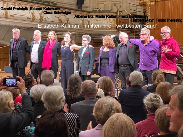 Das Programm hat sich seit der Uraufführung, die ich miterleben und beschreiben durfte, weiter entwickelt. Zum kongenialen Instrumentalteam ist seit einiger Zeit auch eine Viola als achtes Instrument dazu gekommen. Ohne dieses exzellente Instrumentalteam wäre das Projekt nicht möglich. Elisabeth Kulman stellte die Mitglieder dem Grazer Publikum einzeln vor und nannte sie die weltbeste Band. Daher sollen auch hier zu Beginn alle Namen angeführt sein: Elisabeth Kulman Gesang | Idee | Konzept | Arrangements, Aliosha Biz Violine, Clara Schwaiger Viola, Tscho Theissing Diverse Instrumente | Arrangements, Franz Bartolomey Violoncello, Herbert Mayr Kontrabass, Gerald Preinfalk Klarinette | Saxophon, Maria Reiter Akkordeon und Eduard Kutrowatz Klavier – Ein Abend zwischen Oper, Chanson, Kabarett, Pop und Jazz