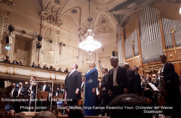 Die überzeugenden Gesangsleistungen wären natürlich nicht möglich gewesen, hätte nicht das Orchester der Wiener Staatsoper mit Rainer Honeck am Konzertmeisterpult glanzvoll gespielt und einfühlam begleitet. Der Musikdirektor der Wiener Staatsoper Philippe Jordan – übrigens auch ein „Walküren-Debütant“ an der Staatsoper! – leitete Orchester und Solisten ungemein konzentriert. Die Positionierung des Orchesters auf dem Podium mit den Solisten davor ermöglicht dem Publikum, so viele Details der Partitur nachzuhören, wie das bei szenischen Aufführungen – dort auch eventuell „abgelenkt“ durch Bühnenbild und Regie – nie möglich ist. Gleichzeitig besteht natürlich die Gefahr, dass das große Orchester die Stimmen in die Defensive drängt (wie ich es zuletzt beim Rosenkavalier in Stuttgart teilweise erlebt hatte). Dies geschah an diesem Abend überhaupt nicht – und das aus zwei Gründen: Die drei Stimmen sind genuine Wagner-Organe, die nie zu forcieren genötigt waren, und der Dirigent schaffte es immer vorbildlich, die Balance zwischen Stimmen und Orchester zu wahren und trotzdem die Vielfalt der Orchesterpartitur plastisch herauszuarbeiten. Nur zwei Beispiele seien herausgegriffen: die prachtvollen Cello-Soli und die furios-glanzvollen 25 Schlusstakte des 1.Aktes, deren umwerfende Brillanz sonst oft in der szenischen Aktion und dem Fallen das Vorhang ein wenig untergehen.