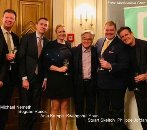 Nach der Pause folgten aus der Götterdämmerung nahtlos aneinandergefügt Siegfrieds Rheinfahrt, Siegfrieds Trauermarsch und Brünnhildes Schlussgesang. Ich hatte den Eindruck, dass nun Philippe Jordan und das Orchester geradezu entspannt und ganz dem Duktus der Partitur hingegeben musizierten – das war Wagnerorchesterklang auf allerhöchstem Niveau. Anja Kampe war eine in ihrer respekteinflößenden Ruhe und mit ihrem alles überstrahlenden (und nie forciertem!) Sopran eine maßstabsetzende Brünnhilde. Das zum allerletzen Mal in gleißender, narkotisch schwerer Süße aufblühende Wiedergeburt-Motiv (Zitat aus dem großartigen und leider nicht online verfügbaren Programmheftbeitrag von Harald Haslmayr) beschloss zweifellos einen bedeutenden Abend in der Geschichte des Grazer Musikvereins. Hier ein Bild der Verantwortlichen für dieses uneingeschränkte Musikglück – schade, dass der Konzertmeister des „weltbesten Opernorchesters“ nicht auch noch auf das Foto gebannt werden konnte: