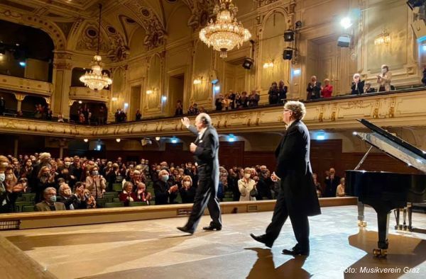 Das offizielle Programm war corona-bedingt ohne Pause auf 55 Minuten beschränkt – 6 große Opernszenen, 2 Lieder von Tosti und die beiden erwähnten Klavierstücke. Aber im Zugabenteil gab es dann noch drei große Opernhits (Rigoletto, La Traviata und Andréa Chenier) und zwei neapolitanische Lieder, diese von James Vaughan auswendig begleitet – auch das ein Gag, den die beiden bereits an der Mailänder Scala vor über 15 Jahren erprobt hatten. Schon damals war bei Non discordar di me das Publikum zum Mitsingen eingeladen. Diesmal in Graz sagte Maestro Nucci knapp und keinen Widerspruch duldend zum Publikum: Maske weg, mitsingen! Das ließ sich das Grazer Publikum nicht zweimal sagen und sang beherzt den Refrain mit, wie auf der Facebook-Seite des Musikvereins nachgehört werden kann.
