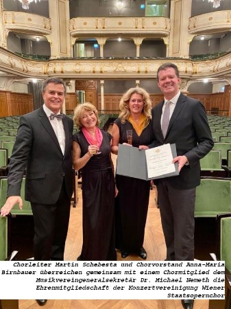 In der Mitte des Programms wurde unterbrochen und der Generalsekretär des Musikvereins Dr.Michael Nemeth auf das Podium gebeten. Ihm wurde – zur merklichen eigenen Überraschung und Freude! – die Ehrenmitgliedschaft der Konzertvereinigung überreicht. Nemeth pflegt seit Jahren den Kontakt mit der Wiener Staatsoper. Nach einem Fidelio-Gastspiel im Jahre 2015 war die Konzertvereinigung Wiener Staatsopernchor zuletzt im Juni 2022 zu Gast in Graz. Auf dem folgenden nach dem Konzert aufgenommenen Foto sieht man sehr schön die freudig-entspannte Stimmung aller.