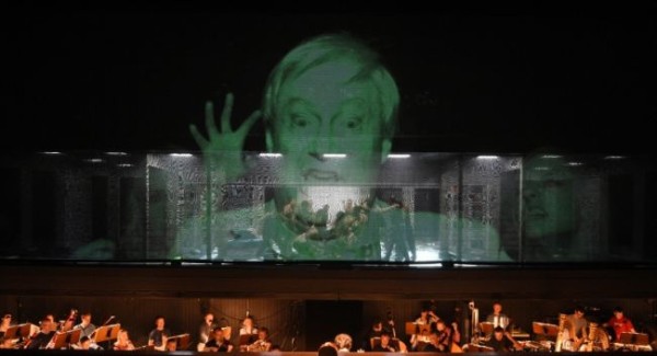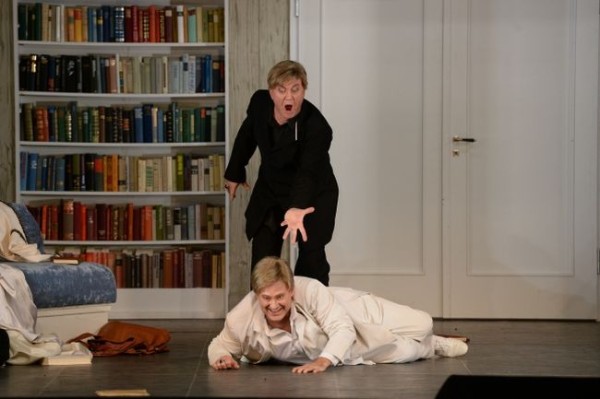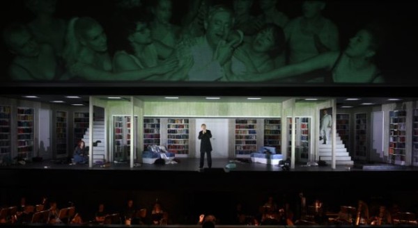 Ein Lob gebührt auch Frank Hilbrich, dem eine opulente, bildgewaltige und trefflich durchdachte Inszenierung zu bescheinigen ist. Das Bühnenbild von Volker Thiele ist zweigeteilt. Die Bibliothek, die den unteren Teil des Raumes bildet, ist schon lange ein von Hilbrich favorisierter Spielort. In einer solchen siedelte er bereits seine Freiburger Produktionen der „Götterdämmerung“ und des „Lohengrin“ an. Nun also auch die Mannheimer „Bassariden“. Die Bücherei, deren Regale bei dem Erdbeben in sich zusammenstürzen, steht für die rationale Welt des Pentheus, in der sich zu Beginn der von Gabriele Rupprecht bunt-modern eingekleidete Chor versammelt. Hier haben wir es mit einer Gesellschaft mit fest fundiertem Untergrund zu tun, die indes etwas ratlos und erstarrt wirkt. Es ist deshalb nicht weiter verwunderlich, dass Dionysos mit dieser festgefahrenen Gemeinschaft leichtes Spiel hat – sein aus dem Off tönender Ruf ist ihr willkommen – und sie problemlos in seine Sphäre zu locken vermag. Diese bildet ein oberhalb der Bibliothek liegender dunkler Raum, der an die Stelle des in dieser Inszenierung unsichtbar bleibenden Berges Kytheron tritt. Und hier bringt Hilbrich gekonnt die Psychologie mit ins Spiel. Während die thebanische Pentheus-Welt für das Bewusste steht, versinnbildlicht die andere das Unbewusste, in der im Lauf des Abends von den Dionysos-Anhängern in Unterwäsche eine eher harmlos anmutende Orgie gefeiert wird. Die Bilder hier sind nicht realer Natur. Vielmehr werden mit Hilfe einer Live-Video-Kamera aufgenommene visuelle Impressionen auf den Gaze-Vorhang des gänzlich schwarzen Raum projiziert. Diese die Grenze zur Surrealität streifenden irrealen Momentaufnahmen sind als Reise in das Innere des Menschen zu verstehen – ein überzeugender Einfall, der von Hilbrichs psychologischen Kenntnissen zeugt.