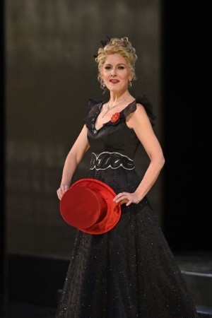 Was aber nichts daran änderte, dass sich das Auditorium köstlich amüsierte. Und man muss zugeben, dass Zanella seine Inszenierung insgesamt recht kurzweilig anlegte, heiter und mit großem Spaßpotential, wobei letzteres auch durch viel Wortwitz vermittelt wurde. So war es beispielsweise recht vergnüglich, wenn sich Rosillon in der Pavillonszene vergeblich bemühte, Valencienne ihren Keuschheitsgürtel abzunehmen. Das mehrmalige In-Ohnmacht-Fallen des Barons Zeta wirkte indes etwas übertrieben. Einmal hätte vollauf genügt. Etwas Klamauk durfte schon mal sein, aber auch Tschechow’sche Elemente. So z. B. ganz zu Beginn, wenn Hanna im schwarzen Witwen-Look vom rechten Seitenportal aus das Treiben beobachtet und dann unauffällig am Rand der Bühne entlang zum Hintergrund geht. Im dritten Akt darf sie sich auch mal kurz unter die Grisetten mischen, die von Valencienne angeführt werden. Diese und Rosillon hätten aber einer etwas schärferen Zeichnung seitens der Regie bedurft. Auch andere kleine Rollen hat der Regisseur leider etwas stiefmütterlich behandelt, sodass diese blass blieben. In dieser Beziehung waren die Gewichte nicht gut verteilt.